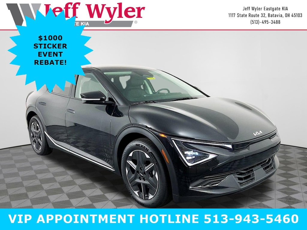 Priced below KBB Fair Purchase Price! Ebony Black 2025 Kia EV6 Light Electric Motor RWD 1-Speed Automatic 128/101 City/Highway MPG Jeff Wyler Eastgate Auto Mall is pleased to offer this fantastic-looking 2025 Kia EV6 Light in Ebony Black. Well equipped with: 4-Wheel Disc Brakes, 6 Speakers, ABS brakes, Air Conditioning, Alloy wheels, AM/FM radio: SiriusXM, Apple CarPlay & Android Auto, Auto High-beam Headlights, Auto-dimming Rear-View mirror, Automatic temperature control, Brake assist, Bumpers: body-color, Cargo Cover, Carpeted Floor Mats, Delay-off headlights, Driver door bin, Driver vanity mirror, Dual front impact airbags, Dual front side impact airbags, Electronic Stability Control, Emergency communication system, Four wheel independent suspension, Front anti-roll bar, Front Bucket Seats, Front Center Armrest, Front dual zone A/C, Front reading lights, Fully automatic headlights, Heated door mirrors, Heated front seats, Heated Front Seats (3-Stage), Illuminated entry, Knee airbag, Low tire pressure warning, Navigation system: AVN 5.0 Navigation System, Occupant sensing airbag, Outside temperature display, Overhead airbag, Overhead console, Panic alarm, Passenger door bin, Passenger vanity mirror, Power door mirrors, Power driver seat, Power steering, Power windows, Rain sensing wipers, Rear anti-roll bar, Rear seat center armrest, Rear side impact airbag, Rear window defroster, Recycled Fabric & Vegan Leather Seat Trim, Remote keyless entry, Security system, Speed control, Speed-sensing steering, Split folding rear seat, Spoiler, Steering wheel mounted audio controls, Telescoping steering wheel, Tilt steering wheel, Traction control, Trip computer, Turn signal indicator mirrors, and Variably intermittent wipers. 128/101 City/Highway MPG Price includes: $1000 - Sticker Sales Event Retail Bonus Cash. Exp. 01/02/2026 $10000 - Kia Customer Cash. Exp. 01/02/2026