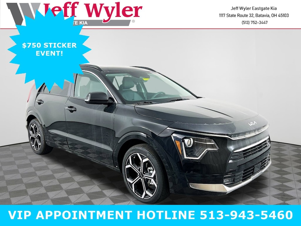 Priced below KBB Fair Purchase Price! Aurora Black Pearl 2025 Kia Niro EX Touring 1.6L I4 DGI Hybrid DOHC 16V LEV3-SULEV30 FWD 6-Speed Dual Clutch 53/45 City/Highway MPG Jeff Wyler Eastgate Auto Mall is excited to offer this fantastic 2025 Kia Niro EX Touring in Aurora Black Pearl. Well equipped with: 4-Wheel Disc Brakes, 6 Speakers, ABS brakes, Air Conditioning, Alloy wheels, AM/FM radio: SiriusXM, Apple CarPlay & Android Auto, Auto High-beam Headlights, Auto-Dimming Mirror w/HomeLink (Wired), Automatic temperature control, Brake assist, Bumpers: body-color, Carpeted Floor Mats, Cloth & Vegan Leather-Trimmed Seats, Delay-off headlights, Driver door bin, Driver vanity mirror, Dual front impact airbags, Dual front side impact airbags, Electronic Stability Control, Emergency communication system: Kia Connect (includes 1 year free trial), Exterior Parking Camera Rear, Four wheel independent suspension, Front anti-roll bar, Front Bucket Seats, Front Center Armrest, Front dual zone A/C, Front fog lights, Front reading lights, Fully automatic headlights, Heated door mirrors, Heated Front Bucket Seats (3-Steps), Heated front seats, Illuminated entry, Knee airbag, Leather Shift Knob, Low tire pressure warning, Navigation System, Occupant sensing airbag, Outside temperature display, Overhead airbag, Overhead console, Panic alarm, Passenger door bin, Passenger vanity mirror, Power door mirrors, Power driver seat, Power moonroof, Power steering, Power windows, Radio: AM/FM/HD/SiriusXM, Rain sensing wipers, Rear anti-roll bar, Rear seat center armrest, Rear window defroster, Rear window wiper, Remote keyless entry, Security system, Speed control, Speed-sensing steering, Split folding rear seat, Spoiler, Steering wheel mounted audio controls, Telescoping steering wheel, Tilt steering wheel, Traction control, Trip computer, Turn signal indicator mirrors, Variably intermittent wipers, and Wheels: 7.5J x 18" Machine Finished Alloy. 53/45 City/Highway MPG Price includes: $750 - Sticker Sales Event Retail Bonus Cash. Exp. 12/01/2025