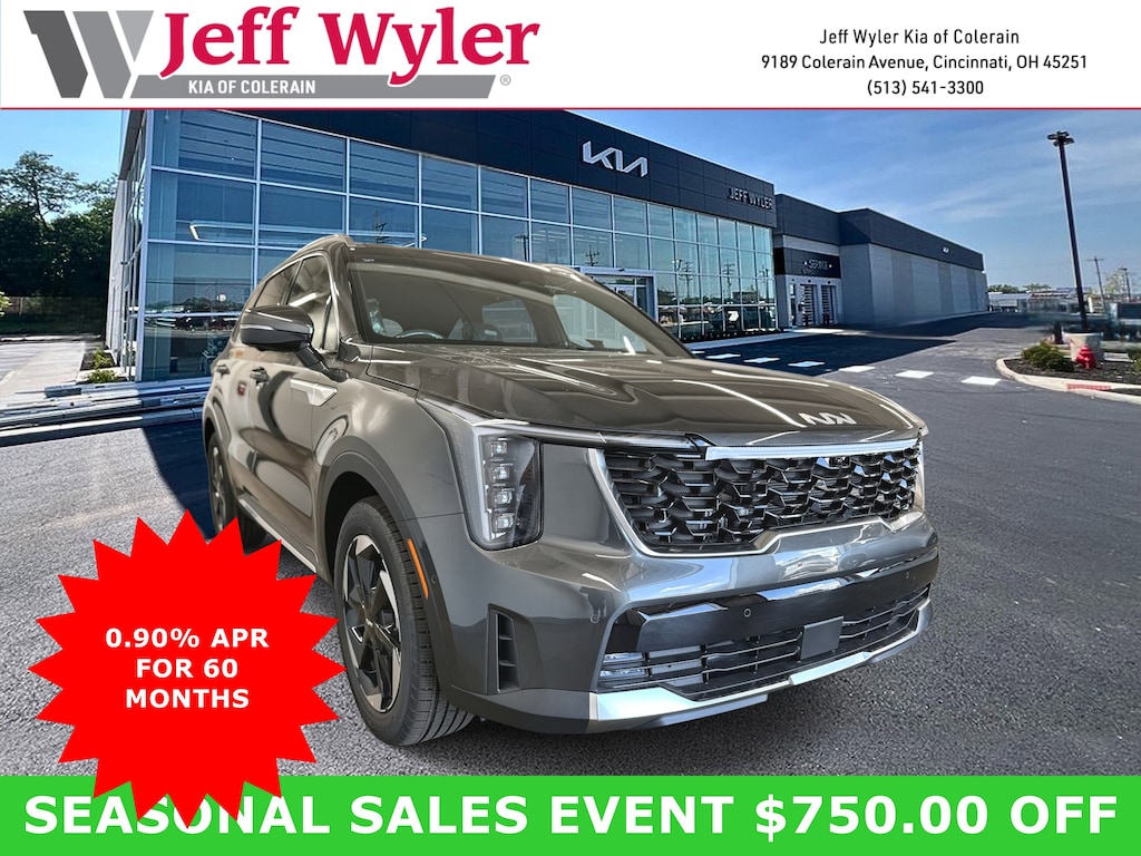 Jeff Wyler Kia of Colerain is pleased to offer this great 2025 Kia Sorento Hybrid SX Prestige in Interstellar Gray. 12 Speakers, 3rd row seats: split-bench, 4-Wheel Disc Brakes, ABS brakes, Air Conditioning, Alloy wheels, AM/FM radio: SiriusXM, Apple CarPlay & Android Auto, Auto High-beam Headlights, Auto-dimming Rear-View mirror, Automatic temperature control, Brake assist, Bumpers: body-color, Delay-off headlights, Driver door bin, Driver vanity mirror, Dual front impact airbags, Dual front side impact airbags, Electronic Stability Control, Emergency communication system: 911 Connect, Exterior Parking Camera Rear, Four wheel independent suspension, Front anti-roll bar, Front Bucket Seats, Front Center Armrest, Front dual zone A/C, Front fog lights, Front reading lights, Fully automatic headlights, Garage door transmitter: HomeLink, Heated & Ventilated Front Bucket Seats, Heated door mirrors, Heated front seats, Heated rear seats, Heated steering wheel, Illuminated entry, Knee airbag, Leather steering wheel, Low tire pressure warning, Memory seat, Navigation System, Occupant sensing airbag, Outside temperature display, Overhead airbag, Overhead console, Panic alarm, Passenger door bin, Passenger vanity mirror, Perforated Genuine Leather Seat Trim, Power door mirrors, Power driver seat, Power Liftgate, Power moonroof, Power passenger seat, Power steering, Power windows, Radio data system, Radio: AM/FM/SiriusXM Audio System, Rain sensing wipers, Rear air conditioning, Rear anti-roll bar, Rear reading lights, Rear window defroster, Rear window wiper, Remote keyless entry, Security system, Speed control, Speed-sensing steering, Split folding rear seat, Spoiler, Steering wheel mounted audio controls, Tachometer, Telescoping steering wheel, Tilt steering wheel, Traction control, Trip computer, Turn signal indicator mirrors, Variably intermittent wipers, Ventilated front seats, and Wheels: 19" Machine-Finished Aero Alloy Our PRE-OWNED vehicles are put through a rigorous 167- POINT QUALITY ASSURANCE INSPECTION along with an average amount of over $1,400.00 SPENT to recondition each vehicle so we can be sure to deliver you the highest quality vehicle like you deserve! ***ONLINE PRICE DOES NOT INCLUDE WYLER FAMILY FIRST PACKAGE*** Price includes: $750 - Sticker Sales Event Retail Bonus Cash. Exp. 12/01/2025