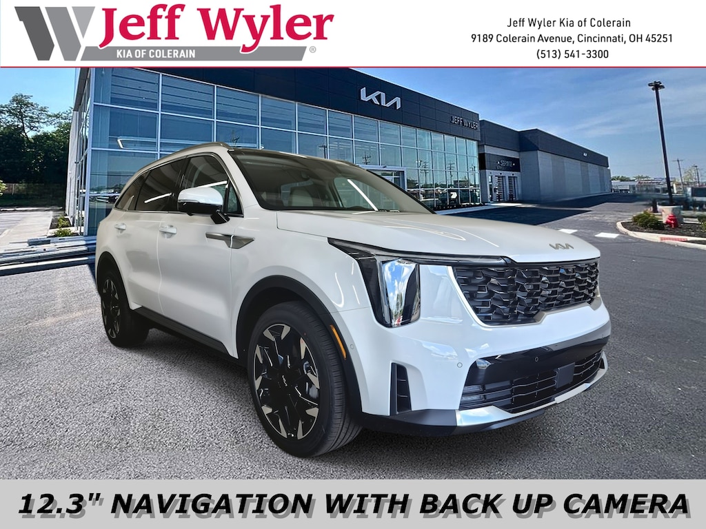 Jeff Wyler Kia of Colerain is very proud to offer this outstanding 2025 Kia Sorento SX in Glacial White Pearl. 3rd row seats: split-bench, 4-Wheel Disc Brakes, 6 Speakers, ABS brakes, Air Conditioning, Alloy wheels, AM/FM radio: SiriusXM, Apple CarPlay & Android Auto, Auto High-beam Headlights, Auto-Dimming Mirror w/HomeLink (PnP), Auto-dimming Rear-View mirror, Automatic temperature control, Brake assist, Bumpers: body-color, Carpeted Floor Mats, Delay-off headlights, Driver door bin, Driver vanity mirror, Dual front impact airbags, Dual front side impact airbags, Electronic Stability Control, Emergency communication system: 911 Connect, Exterior Parking Camera Rear, Four wheel independent suspension, Front anti-roll bar, Front Bucket Seats, Front Center Armrest, Front dual zone A/C, Front fog lights, Front reading lights, Fully automatic headlights, Heated & Ventilated Front Bucket Seats, Heated door mirrors, Heated front seats, Illuminated entry, Knee airbag, Leather Shift Knob, Leather steering wheel, Low tire pressure warning, Navigation System, Occupant sensing airbag, Outside temperature display, Overhead airbag, Overhead console, Panic alarm, Passenger door bin, Passenger vanity mirror, Power door mirrors, Power driver seat, Power Liftgate, Power moonroof, Power passenger seat, Power steering, Power windows, Radio data system, Radio: AM/FM Standard Sound System, Rain sensing wipers, Rear anti-roll bar, Rear reading lights, Rear side impact airbag, Rear window defroster, Rear window wiper, Remote keyless entry, Security system, Speed control, Speed-sensing steering, Split folding rear seat, Spoiler, Steering wheel mounted audio controls, SynTex Artificial Leather Seat Trim, Tachometer, Telescoping steering wheel, Tilt steering wheel, Traction control, Trip computer, Turn signal indicator mirrors, Variably intermittent wipers, Ventilated front seats, and Wheels: 20" Machine-Finished Gloss Black Alloy Our PRE-OWNED vehicles are put through a rigorous 167- POINT QUALITY ASSURANCE INSPECTION along with an average amount of over $1,400.00 SPENT to recondition each vehicle so we can be sure to deliver you the highest quality vehicle like you deserve! ***ONLINE PRICE DOES NOT INCLUDE WYLER FAMILY FIRST PACKAGE***
