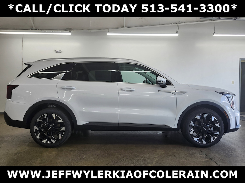 Jeff Wyler Kia of Colerain is very proud to offer this good-looking 2025 Kia Sorento SX in Glacial White Pearl. 3rd row seats: split-bench, 4-Wheel Disc Brakes, 6 Speakers, ABS brakes, Air Conditioning, Alloy wheels, AM/FM radio: SiriusXM, Apple CarPlay & Android Auto, Auto High-beam Headlights, Auto-dimming Rear-View mirror, Automatic temperature control, Brake assist, Bumpers: body-color, Cargo Cover, Carpeted Floor Mats, Delay-off headlights, Driver door bin, Driver vanity mirror, Dual front impact airbags, Dual front side impact airbags, Electronic Stability Control, Emergency communication system: 911 Connect, Exterior Parking Camera Rear, Four wheel independent suspension, Front anti-roll bar, Front Bucket Seats, Front Center Armrest, Front dual zone A/C, Front fog lights, Front reading lights, Fully automatic headlights, Heated & Ventilated Front Bucket Seats, Heated door mirrors, Heated front seats, Illuminated entry, Knee airbag, Leather Shift Knob, Leather steering wheel, Low tire pressure warning, Mudguards, Navigation System, Occupant sensing airbag, Outside temperature display, Overhead airbag, Overhead console, Panic alarm, Passenger door bin, Passenger vanity mirror, Power door mirrors, Power driver seat, Power Liftgate, Power moonroof, Power passenger seat, Power steering, Power windows, Radio data system, Radio: AM/FM Standard Sound System, Rain sensing wipers, Rear anti-roll bar, Rear reading lights, Rear Seat Entertainment System, Rear side impact airbag, Rear window defroster, Rear window wiper, Remote keyless entry, Security system, Speed control, Speed-sensing steering, Split folding rear seat, Spoiler, Steering wheel mounted audio controls, SynTex Artificial Leather Seat Trim, Tachometer, Telescoping steering wheel, Tilt steering wheel, Traction control, Trip computer, Turn signal indicator mirrors, Variably intermittent wipers, Ventilated front seats, and Wheels: 20" Machine-Finished Gloss Black Alloy Our PRE-OWNED vehicles are put through a rigorous 167- POINT QUALITY ASSURANCE INSPECTION along with an average amount of over $1,400.00 SPENT to recondition each vehicle so we can be sure to deliver you the highest quality vehicle like you deserve! ***ONLINE PRICE DOES NOT INCLUDE WYLER FAMILY FIRST PACKAGE*** Price includes: $750 - Sticker Sales Event Retail Bonus Cash. Exp. 12/01/2025