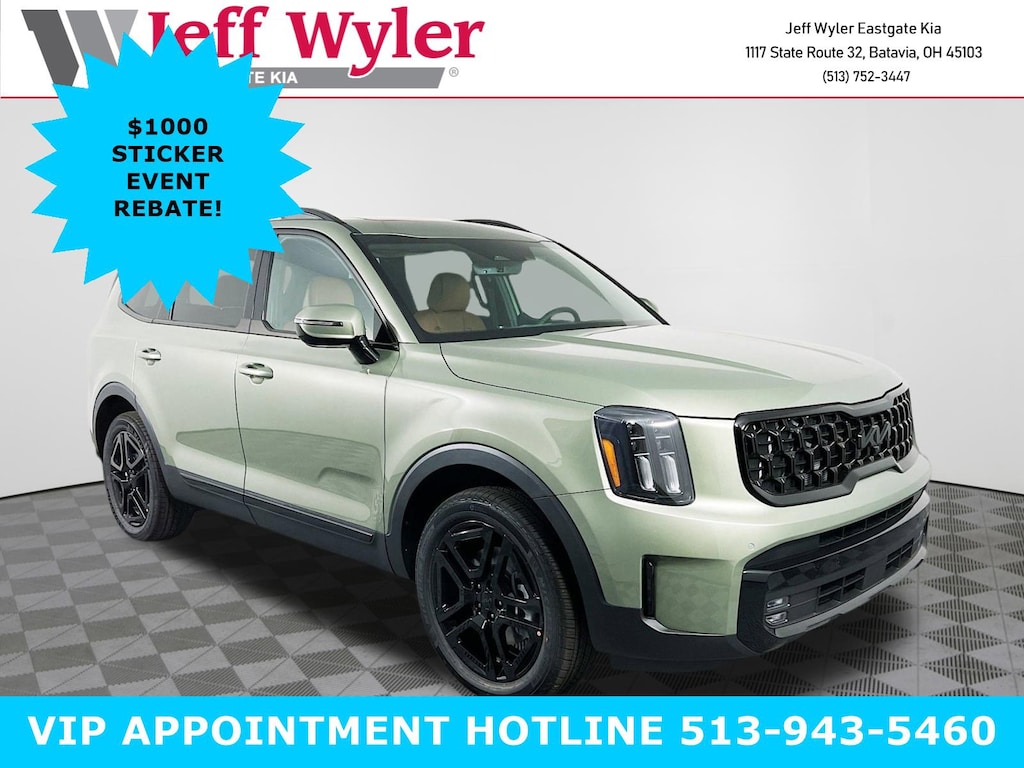 Priced below KBB Fair Purchase Price! Jungle Green 2025 Kia Telluride SX X-Line 3.8L V6 DOHC AWD 8-Speed Automatic 18/23 City/Highway MPG Jeff Wyler Eastgate Auto Mall is pleased to offer this gorgeous 2025 Kia Telluride SX X-Line in Jungle Green. Well equipped with: Terracotta Interior Color Package, 10 Speakers, 3rd row seats: split-bench, 4-Wheel Disc Brakes, ABS brakes, Air Conditioning, Alloy wheels, AM/FM radio: SiriusXM, Apple CarPlay & Android Auto, Auto High-beam Headlights, Auto-dimming Rear-View mirror, Auto-leveling suspension, Automatic temperature control, Brake assist, Bumpers: body-color, Cargo Cover, Carpeted Floor Mats, Compass, Delay-off headlights, Driver door bin, Driver vanity mirror, Dual front impact airbags, Dual front side impact airbags, Electronic Stability Control, Emergency communication system: 911 Connect, Exterior Parking Camera Rear, Four wheel independent suspension, Front anti-roll bar, Front Bucket Seats, Front Center Armrest, Front dual zone A/C, Front fog lights, Front reading lights, Fully automatic headlights, Garage door transmitter: HomeLink, harman/kardon® Speakers, Heated & Ventilated Front Bucket Seats, Heated door mirrors, Heated front seats, Heated steering wheel, Illuminated entry, Knee airbag, Leather Seat Trim, Leather Shift Knob, Leather steering wheel, Low tire pressure warning, Memory seat, Navigation System, Occupant sensing airbag, Outside temperature display, Overhead airbag, Overhead console, Panic alarm, Passenger door bin, Passenger vanity mirror, Power door mirrors, Power driver seat, Power Liftgate, Power moonroof, Power passenger seat, Power steering, Power windows, Radio data system, Radio: AM/FM Harman Kardon Audio System, Rear air conditioning, Rear anti-roll bar, Rear audio controls, Rear reading lights, Rear side impact airbag, Rear window defroster, Rear window wiper, Reclining 3rd row seat, Remote keyless entry, Security system, Speed control, Speed-sensing steering, Split folding rear seat, Spoiler, Steering wheel mounted audio controls, Tachometer, Telescoping steering wheel, Tilt steering wheel, Traction control, Trip computer, Turn signal indicator mirrors, Variably intermittent wipers, Ventilated front seats, and Wheels: 20" x 7.5" Black Finish X-LINE Exclusive. Price includes: $1000 - Sticker Sales Event Retail Bonus Cash. Exp. 01/02/2026