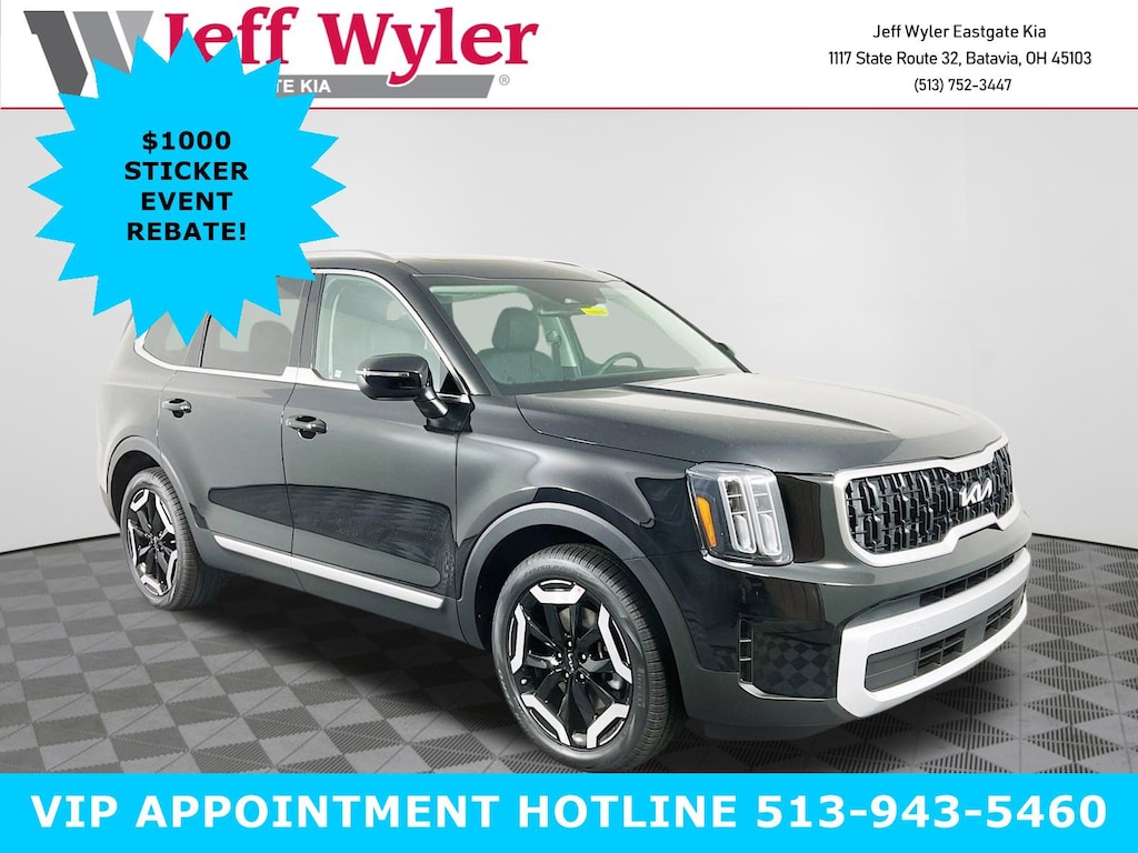 Ebony Black 2025 Kia Telluride EX 3.8L V6 DOHC AWD 8-Speed Automatic 18/23 City/Highway MPG Jeff Wyler Eastgate Auto Mall is honored to offer this terrific-looking 2025 Kia Telluride EX in Ebony Black. Well equipped with: 3rd row seats: split-bench, 4-Wheel Disc Brakes, 6 Speakers, ABS brakes, Air Conditioning, All Weather Floor Mats, Alloy wheels, AM/FM radio: SiriusXM, Apple CarPlay & Android Auto, Auto High-beam Headlights, Auto-dimming Rear-View mirror, Automatic temperature control, Brake assist, Bumpers: body-color, Compass, Delay-off headlights, Driver door bin, Driver vanity mirror, Dual front impact airbags, Dual front side impact airbags, Electronic Stability Control, Emergency communication system: 911 Connect, Exterior Parking Camera Rear, Four wheel independent suspension, Front anti-roll bar, Front Bucket Seats, Front Center Armrest, Front dual zone A/C, Front reading lights, Fully automatic headlights, Heated & Ventilated Front Bucket Seats, Heated door mirrors, Heated front seats, Illuminated entry, Knee airbag, Leather Seat Trim, Leather Shift Knob, Leather steering wheel, Low tire pressure warning, Navigation System, Occupant sensing airbag, Outside temperature display, Overhead airbag, Overhead console, Panic alarm, Passenger door bin, Passenger vanity mirror, Power door mirrors, Power driver seat, Power Liftgate, Power moonroof, Power passenger seat, Power steering, Power windows, Radio data system, Radio: AM/FM Display Audio System, Rear air conditioning, Rear anti-roll bar, Rear audio controls, Rear reading lights, Rear seat center armrest, Rear side impact airbag, Rear window defroster, Rear window wiper, Reclining 3rd row seat, Remote keyless entry, Security system, Speed control, Speed-sensing steering, Split folding rear seat, Spoiler, Steering wheel mounted audio controls, Tachometer, Telescoping steering wheel, Tilt steering wheel, Traction control, Trip computer, Turn signal indicator mirrors, Variably intermittent wipers, Ventilated front seats, and Wheels: 20" x 7.5" Black Finish.