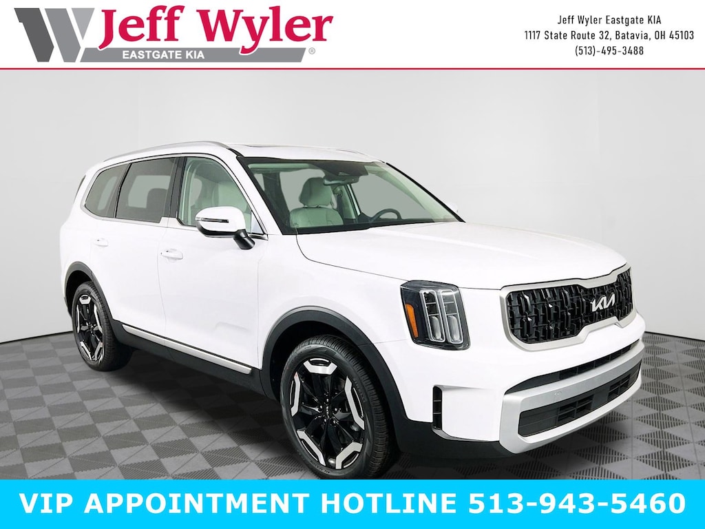 Priced below KBB Fair Purchase Price! Glacial White Pearl 2025 Kia Telluride EX 3.8L V6 DOHC FWD 8-Speed Automatic 20/26 City/Highway MPG Jeff Wyler Eastgate Auto Mall is pleased to offer this good-looking 2025 Kia Telluride EX in Glacial White Pearl. Well equipped with: 3rd row seats: split-bench, 4-Wheel Disc Brakes, ABS brakes, Air Conditioning, All Weather Floor Mats, Alloy wheels, AM/FM radio: SiriusXM, Apple CarPlay & Android Auto, Auto High-beam Headlights, Auto-dimming Rear-View mirror, Automatic temperature control, Brake assist, Bumpers: body-color, Compass, Cross Bars, Delay-off headlights, Driver door bin, Driver vanity mirror, Dual front impact airbags, Dual front side impact airbags, Electronic Stability Control, Emergency communication system: 911 Connect, Exterior Parking Camera Rear, Four wheel independent suspension, Front anti-roll bar, Front Bucket Seats, Front Center Armrest, Front dual zone A/C, Front reading lights, Fully automatic headlights, Heated & Ventilated Front Bucket Seats, Heated door mirrors, Heated front seats, Illuminated entry, Knee airbag, Leather Seat Trim, Leather Shift Knob, Leather steering wheel, Low tire pressure warning, Navigation System, Occupant sensing airbag, Outside temperature display, Overhead airbag, Overhead console, Panic alarm, Passenger door bin, Passenger vanity mirror, Power door mirrors, Power driver seat, Power Liftgate, Power moonroof, Power passenger seat, Power steering, Power windows, Radio data system, Rear air conditioning, Rear anti-roll bar, Rear audio controls, Rear reading lights, Rear seat center armrest, Rear side impact airbag, Rear window defroster, Rear window wiper, Reclining 3rd row seat, Remote keyless entry, Security system, Speed control, Speed-sensing steering, Split folding rear seat, Spoiler, Steering wheel mounted audio controls, Tachometer, Telescoping steering wheel, Tilt steering wheel, Traction control, Trip computer, Turn signal indicator mirrors, Variably intermittent wipers, Ventilated front seats, and Wheels: 20" x 7.5" Black Finish. 20/26 City/Highway MPG Price includes: $2000 - Kia Customer Cash. Exp. 03/02/2026