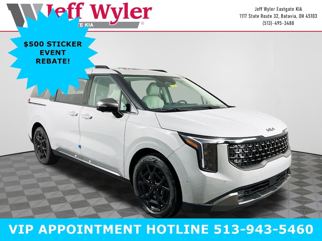 Ceramic Silver 2026 Kia Carnival Hybrid SX 1.6L I4 DGI Hybrid Turbocharged DOHC 16V LEV3-SULEV30 FWD 6-Speed Automatic 34/31 City/Highway MPG Jeff Wyler Eastgate Auto Mall is excited to offer this fantastic 2026 Kia Carnival Hybrid SX in Ceramic Silver. Well equipped with: SX Dark Edition Package (Dark Edition Interior Design and Wheels: 19" Black D-Cut Customizing), 3rd row seats: split-bench, 4-Wheel Disc Brakes, 8 Speakers, ABS brakes, Air Conditioning, Alloy wheels, AM/FM radio: SiriusXM, Apple CarPlay & Android Auto, Artificial Leather Seat Trim, Auto High-beam Headlights, Auto-Dimming Mirror w/HomeLink, Automatic temperature control, Brake assist, Bumpers: body-color, Carpeted Floor Mats (8-Passenger), Compass, Dark Edition Front Grille Trim, Dark Edition Mirror Caps, Dark Edition Roof Rails, Delay-off headlights, Driver door bin, Driver vanity mirror, Dual front impact airbags, Dual front side impact airbags, Electronic Stability Control, Emergency communication system, Exterior Parking Camera Rear, Four wheel independent suspension, Front anti-roll bar, Front Bucket Seats, Front Center Armrest, Front dual zone A/C, Front fog lights, Front reading lights, Fully automatic headlights, Heated & Ventilated Front Bucket Seats, Heated door mirrors, Heated front seats, Illuminated entry, Knee airbag, Leather Shift Knob, Leather steering wheel, Low tire pressure warning, Memory seat, Navigation System, Occupant sensing airbag, Outside temperature display, Overhead airbag, Overhead console, Panic alarm, Passenger door bin, Passenger vanity mirror, Power 2nd-Row Moonroof, Power door mirrors, Power driver seat, Power Liftgate, Power moonroof, Power passenger seat, Power steering, Power windows, Radio: Navigation System w/SiriusXM, Rain sensing wipers, Rear air conditioning, Rear anti-roll bar, Rear reading lights, Rear window defroster, Rear window wiper, Reclining 3rd row seat, Remote keyless entry, Security system, Speed control, Speed-sensing steering, Split folding rear seat, Spoiler, Steering wheel mounted audio controls, Tachometer, Telescoping steering wheel, Tilt steering wheel, Traction control, Trip computer, Turn signal indicator mirrors, Variably intermittent wipers, Ventilated front seats, and Wheels: 19" Black Alloy. 34/31 City/Highway MPG Price includes: $500 - Sticker Sales Event Retail Bonus Cash. Exp. 01/02/2026