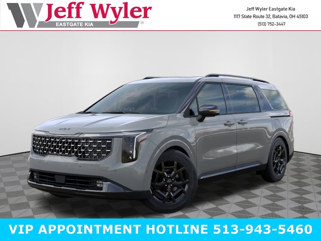 Ceramic Silver 2026 Kia Carnival Hybrid SX Prestige 1.6L I4 DGI Hybrid Turbocharged DOHC 16V LEV3-SULEV30 FWD 6-Speed Automatic 34/31 City/Highway MPG Jeff Wyler Eastgate Auto Mall is pumped up to offer this attractive 2026 Kia Carnival Hybrid SX Prestige in Ceramic Silver. Well equipped with: 12 Speakers, 3rd row seats: split-bench, 4-Wheel Disc Brakes, ABS brakes, Air Conditioning, All Weather Floor Mats (8-Passenger), Alloy wheels, AM/FM radio: SiriusXM, Apple CarPlay & Android Auto, Auto High-beam Headlights, Auto-dimming Rear-View mirror, Automatic temperature control, Brake assist, Bumpers: body-color, Compass, Delay-off headlights, Driver door bin, Driver vanity mirror, Dual front impact airbags, Dual front side impact airbags, Electronic Stability Control, Emergency communication system, Exterior Parking Camera Rear, Four wheel independent suspension, Front anti-roll bar, Front Bucket Seats, Front Center Armrest, Front dual zone A/C, Front fog lights, Front reading lights, Fully automatic headlights, Garage door transmitter: HomeLink, Heads-Up Display, Heated & Ventilated Front Bucket Seats, Heated door mirrors, Heated front seats, Heated steering wheel, Illuminated entry, Knee airbag, Leather Seat Trim, Leather Shift Knob, Leather steering wheel, Low tire pressure warning, Memory seat, Navigation System, Occupant sensing airbag, Outside temperature display, Overhead airbag, Overhead console, Panic alarm, Passenger door bin, Passenger vanity mirror, Power 2nd-Row Moonroof, Power door mirrors, Power driver seat, Power Liftgate, Power moonroof, Power passenger seat, Power steering, Power windows, Radio: Navigation System w/SiriusXM, Rain sensing wipers, Rear air conditioning, Rear anti-roll bar, Rear reading lights, Rear window defroster, Rear window wiper, Reclining 3rd row seat, Remote keyless entry, Security system, Speed control, Speed-sensing steering, Split folding rear seat, Spoiler, Steering wheel mounted audio controls, Tachometer, Telescoping steering wheel, Tilt steering wheel, Traction control, Trip computer, Turn signal indicator mirrors, Variably intermittent wipers, Ventilated front seats, and Wheels: 19" Black D-Cut Customizing. 34/31 City/Highway MPG