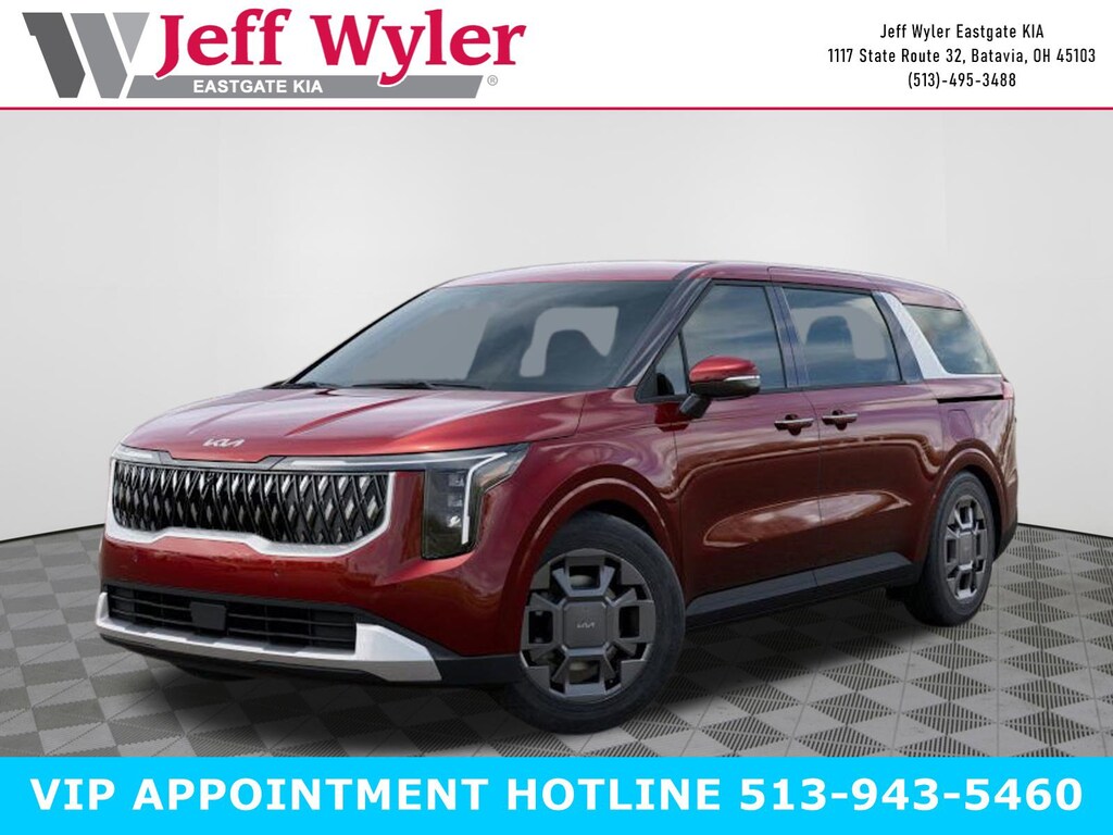 Red 2026 Kia Carnival Hybrid EX 1.6L I4 DGI Hybrid Turbocharged DOHC 16V LEV3-SULEV30 FWD 6-Speed Automatic 34/31 City/Highway MPG Jeff Wyler Eastgate Auto Mall is proud to offer this stunning 2026 Kia Carnival Hybrid EX in Red. Well equipped with: 3rd row seats: split-bench, 4-Wheel Disc Brakes, 8 Speakers, ABS brakes, Air Conditioning, All Weather Floor Mats (8-Passenger), Alloy wheels, AM/FM radio: SiriusXM, Apple CarPlay & Android Auto, Artificial Leather Seat Trim, Auto High-beam Headlights, Auto-Dimming Mirror with HomeLink, Automatic temperature control, Brake assist, Bumpers: body-color, Compass, Delay-off headlights, Driver door bin, Driver vanity mirror, Dual front impact airbags, Dual front side impact airbags, Electronic Stability Control, Emergency communication system, Exterior Parking Camera Rear, Four wheel independent suspension, Front anti-roll bar, Front Bucket Seats, Front Center Armrest, Front dual zone A/C, Front reading lights, Fully automatic headlights, Heated door mirrors, Heated Front Bucket Seats, Heated front seats, Illuminated entry, Knee airbag, Leather Shift Knob, Leather steering wheel, Low tire pressure warning, Memory seat, Navigation System, Occupant sensing airbag, Outside temperature display, Overhead airbag, Overhead console, Panic alarm, Passenger door bin, Passenger vanity mirror, Power door mirrors, Power driver seat, Power Liftgate, Power passenger seat, Power steering, Power windows, Radio: : Navigation System with SiriusXM, Rear air conditioning, Rear anti-roll bar, Rear reading lights, Rear window defroster, Rear window wiper, Reclining 3rd row seat, Remote keyless entry, Security system, Speed control, Speed-sensing steering, Split folding rear seat, Spoiler, Steering wheel mounted audio controls, Tachometer, Telescoping steering wheel, Tilt steering wheel, Traction control, Trip computer, Turn signal indicator mirrors, Variably intermittent wipers, and Wheels: 19" Black Alloy. 34/31 City/Highway MPG