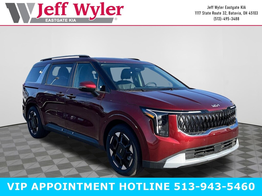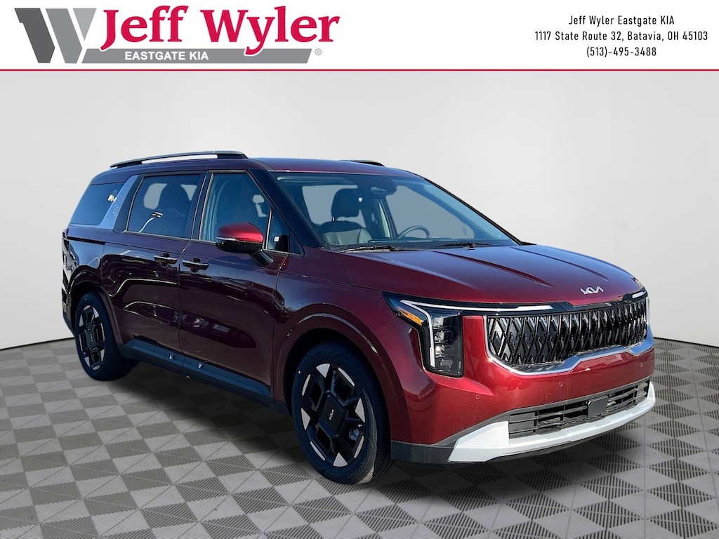 Flare Red 2026 Kia Carnival EX V6 FWD 8-Speed Automatic 18/26 City/Highway MPG Jeff Wyler Eastgate Auto Mall is pleased to offer this beautiful-looking 2026 Kia Carnival EX in Flare Red. Well equipped with: 3.51 Axle Ratio, 3rd row seats: split-bench, 4-Wheel Disc Brakes, 8 Speakers, ABS brakes, Air Conditioning, Alloy wheels, AM/FM radio: SiriusXM, Apple CarPlay & Android Auto, Artificial Leather Seat Trim, Auto High-beam Headlights, Auto-Dimming Mirror with HomeLink, Automatic temperature control, Brake assist, Bumpers: body-color, Carpeted Floor Mats (8-Passenger), Compass, Delay-off headlights, Driver door bin, Driver vanity mirror, Dual front impact airbags, Dual front side impact airbags, Electronic Stability Control, Emergency communication system, Exterior Parking Camera Rear, Four wheel independent suspension, Front anti-roll bar, Front Bucket Seats, Front Center Armrest, Front dual zone A/C, Front reading lights, Fully automatic headlights, Heated door mirrors, Heated Front Bucket Seats, Heated front seats, Illuminated entry, Knee airbag, Leather Shift Knob, Leather steering wheel, Low tire pressure warning, Memory seat, Navigation System, Occupant sensing airbag, Outside temperature display, Overhead airbag, Overhead console, Panic alarm, Passenger door bin, Passenger vanity mirror, Power door mirrors, Power driver seat, Power Liftgate, Power passenger seat, Power steering, Power windows, Radio: AM/FM/HD Audio System, Rear air conditioning, Rear anti-roll bar, Rear reading lights, Rear window defroster, Rear window wiper, Reclining 3rd row seat, Remote keyless entry, Security system, Speed control, Speed-sensing steering, Split folding rear seat, Spoiler, Steering wheel mounted audio controls, Tachometer, Telescoping steering wheel, Tilt steering wheel, Traction control, Trip computer, Turn signal indicator mirrors, Variably intermittent wipers, and Wheels: 7.5J x 19" Machine-Finished Alloy. 18/26 City/Highway MPG