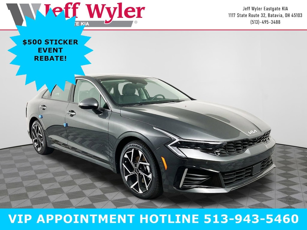Priced below KBB Fair Purchase Price! Interstellar Gray 2026 Kia K5 EX I4 FWD 8-Speed Automatic 25/36 City/Highway MPG Jeff Wyler Eastgate Auto Mall is delighted to offer this wonderful 2026 Kia K5 EX in Interstellar Gray. Well equipped with: 12 Speakers, 4-Wheel Disc Brakes, ABS brakes, Air Conditioning, Alloy wheels, AM/FM radio: SiriusXM, Auto High-beam Headlights, Automatic temperature control, Brake assist, Bumpers: body-color, Delay-off headlights, Driver door bin, Driver vanity mirror, Dual front impact airbags, Dual front side impact airbags, Electronic Stability Control, Emergency communication system: Kia Connect (includes 1 year free trial), Four wheel independent suspension, Front anti-roll bar, Front Bucket Seats, Front Center Armrest, Front dual zone A/C, Front reading lights, Fully automatic headlights, Heated and Ventilated Front Bucket Seats, Heated door mirrors, Heated front seats, Heated steering wheel, Illuminated entry, Knee airbag, Leather Shift Knob, Leather steering wheel, Low tire pressure warning, Memory seat, Navigation System, Occupant sensing airbag, Outside temperature display, Overhead airbag, Overhead console, Panic alarm, Passenger door bin, Passenger vanity mirror, Power door mirrors, Power driver seat, Power moonroof, Power passenger seat, Power steering, Power windows, Radio data system, Radio: AM/FM Audio System, Rear anti-roll bar, Rear reading lights, Rear seat center armrest, Rear side impact airbag, Rear window defroster, Remote keyless entry, Security system, Speed control, Speed-sensing steering, Split folding rear seat, Steering wheel mounted audio controls, SynTex Seat Trim, Tachometer, Telescoping steering wheel, Tilt steering wheel, Traction control, Trip computer, Turn signal indicator mirrors, Variably intermittent wipers, Ventilated front seats, and Wheels: 18" x 7.5J Gloss Black Machined Finish Alloy. 25/36 City/Highway MPG Price includes: $500 - Sticker Sales Event Retail Bonus Cash. Exp. 01/02/2026