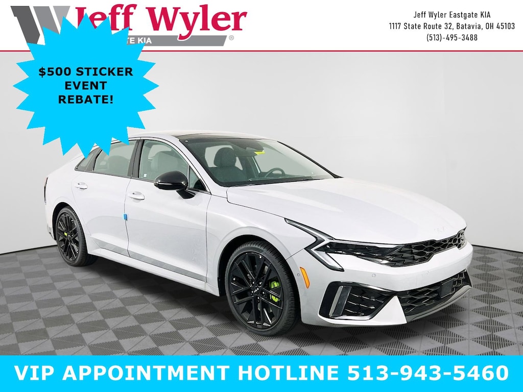 Wolf Gray 2026 Kia K5 GT I4 FWD 8-Speed DCT 23/33 City/Highway MPG Jeff Wyler Eastgate Auto Mall is honored to offer this fantastic-looking 2026 Kia K5 GT in Wolf Gray. Well equipped with: GT1 Package (12.3" Instrument Display, Active Sound Design, Auto Up/Down Front Passenger and Rear Windows, Blind-Spot View Monitor, Bose Premium Audio, Heated Steering Wheel, Memory Driver's Seat and Outside Mirrors, Parking Collision Avoidance-Assist - Reverse, Parking Distance Warning - Side, Power Folding Mirrors, Power Front Passenger Seat, Smartphone Digital Key, Surround View Monitor, Ventilated Front Seats, and Wheels: 19" x 8.0J Gloss Black Custom Alloy), 4-Wheel Disc Brakes, 6 Speakers, ABS brakes, Air Conditioning, Alloy wheels, AM/FM radio: SiriusXM, Auto High-beam Headlights, Automatic temperature control, Brake assist, Bumpers: body-color, Delay-off headlights, Driver door bin, Driver vanity mirror, Dual front impact airbags, Dual front side impact airbags, Electronic Stability Control, Emergency communication system: Kia Connect (includes 1 year free trial), Four wheel independent suspension, Front anti-roll bar, Front Bucket Seats, Front Center Armrest, Front dual zone A/C, Front fog lights, Front reading lights, Fully automatic headlights, Heated door mirrors, Heated front seats, Heated Sport Bucket Seats, Illuminated entry, Knee airbag, Leather Shift Knob, Leather steering wheel, Low tire pressure warning, Navigation System, Occupant sensing airbag, Outside temperature display, Overhead airbag, Overhead console, Panic alarm, Passenger door bin, Passenger vanity mirror, Power door mirrors, Power driver seat, Power moonroof, Power steering, Power windows, Radio data system, Radio: AM/FM Audio System, Rear anti-roll bar, Rear reading lights, Rear seat center armrest, Rear side impact airbag, Rear window defroster, Remote keyless entry, Security system, Speed control, Speed-sensing steering, Split folding rear seat, Sport steering wheel, Steering wheel mounted audio controls, SynTex Seat Trim, Tachometer, Telescoping steering wheel, Tilt steering wheel, Traction control, Trip computer, Turn signal indicator mirrors, Variably intermittent wipers, and Wheels: 19" x 8.0J Gloss Black Machined Finish Alloy. 23/33 City/Highway MPG Price includes: $500 - Sticker Sales Event Retail Bonus Cash. Exp. 01/02/2026