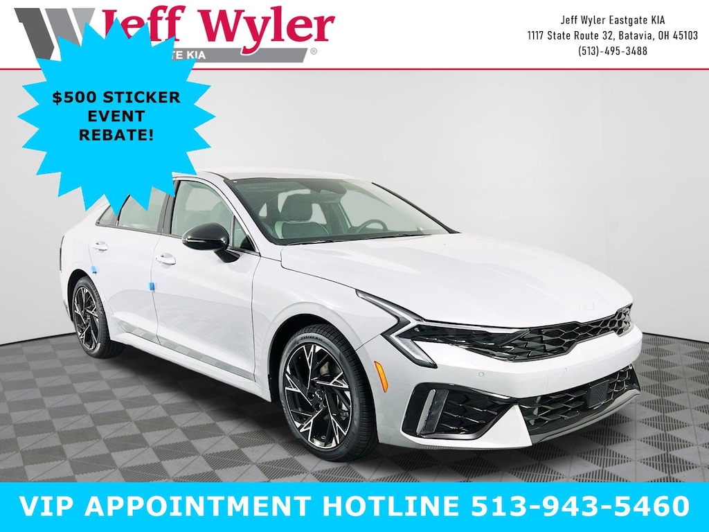 Wolf Gray 2026 Kia K5 GT-Line I4 AWD 8-Speed Automatic 24/33 City/Highway MPG Jeff Wyler Eastgate Auto Mall is excited to offer this attractive-looking 2026 Kia K5 GT-Line in Wolf Gray. Well equipped with: 4-Wheel Disc Brakes, 6 Speakers, ABS brakes, Air Conditioning, Alloy wheels, AM/FM radio: SiriusXM, Apple CarPlay & Android Auto, Auto High-beam Headlights, Automatic temperature control, Brake assist, Bumpers: body-color, Cargo Mat, Cargo Net, Carpeted Floor Mats, Delay-off headlights, Driver door bin, Driver vanity mirror, Dual front impact airbags, Dual front side impact airbags, Electronic Stability Control, Emergency communication system: Kia Connect (includes 1 year free trial), Four wheel independent suspension, Front anti-roll bar, Front Bucket Seats, Front Center Armrest, Front dual zone A/C, Front fog lights, Front reading lights, Fully automatic headlights, Heated door mirrors, Heated Front Bucket Seats, Heated front seats, Heated steering wheel, Illuminated entry, Knee airbag, Leather Shift Knob, Leather steering wheel, Low tire pressure warning, Navigation System, Occupant sensing airbag, Outside temperature display, Overhead airbag, Overhead console, Panic alarm, Passenger door bin, Passenger vanity mirror, Power door mirrors, Power driver seat, Power steering, Power windows, Radio data system, Radio: AM/FM Audio System, Rear anti-roll bar, Rear seat center armrest, Rear side impact airbag, Rear window defroster, Remote keyless entry, Security system, Speed control, Speed-sensing steering, Split folding rear seat, Sport steering wheel, Steering wheel mounted audio controls, Tachometer, Telescoping steering wheel, Tilt steering wheel, Traction control, Trip computer, Turn signal indicator mirrors, Variably intermittent wipers, and Wheels: 18" x 7.5J Gloss Black Machined Finish Alloy. 24/33 City/Highway MPG Price includes: $500 - Sticker Sales Event Retail Bonus Cash. Exp. 01/02/2026