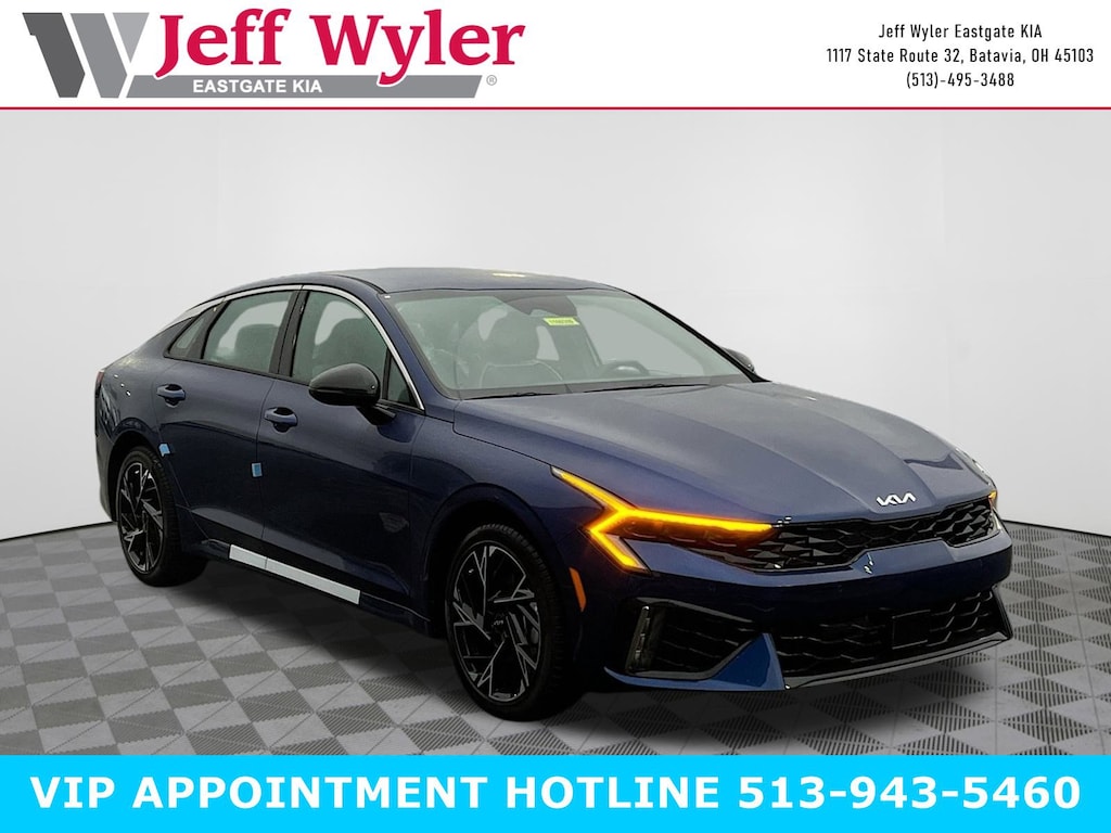 Yacht Blue 2026 Kia K5 GT-Line I4 AWD 8-Speed Automatic 24/33 City/Highway MPG Jeff Wyler Eastgate Auto Mall is excited to offer this fantastic-looking 2026 Kia K5 GT-Line in Yacht Blue. Well equipped with: 4-Wheel Disc Brakes, 6 Speakers, ABS brakes, Air Conditioning, Alloy wheels, AM/FM radio: SiriusXM, Auto High-beam Headlights, Auto-Dimming Mirror with HomeLink, Automatic temperature control, Brake assist, Bumpers: body-color, Delay-off headlights, Driver door bin, Driver vanity mirror, Dual front impact airbags, Dual front side impact airbags, Electronic Stability Control, Emergency communication system: Kia Connect (includes 1 year free trial), Four wheel independent suspension, Front anti-roll bar, Front Bucket Seats, Front Center Armrest, Front dual zone A/C, Front fog lights, Front reading lights, Fully automatic headlights, Heated door mirrors, Heated Front Bucket Seats, Heated front seats, Illuminated entry, Knee airbag, Leather Shift Knob, Leather steering wheel, Low tire pressure warning, Navigation System, Occupant sensing airbag, Outside temperature display, Overhead airbag, Overhead console, Panic alarm, Passenger door bin, Passenger vanity mirror, Power door mirrors, Power driver seat, Power steering, Power windows, Radio data system, Radio: AM/FM Audio System, Rear anti-roll bar, Rear seat center armrest, Rear side impact airbag, Rear window defroster, Remote keyless entry, Security system, Speed control, Speed-sensing steering, Split folding rear seat, Sport steering wheel, Steering wheel mounted audio controls, Tachometer, Telescoping steering wheel, Tilt steering wheel, Traction control, Trip computer, Turn signal indicator mirrors, Variably intermittent wipers, and Wheels: 18" x 7.5J Gloss Black Machined Finish Alloy. 24/33 City/Highway MPG