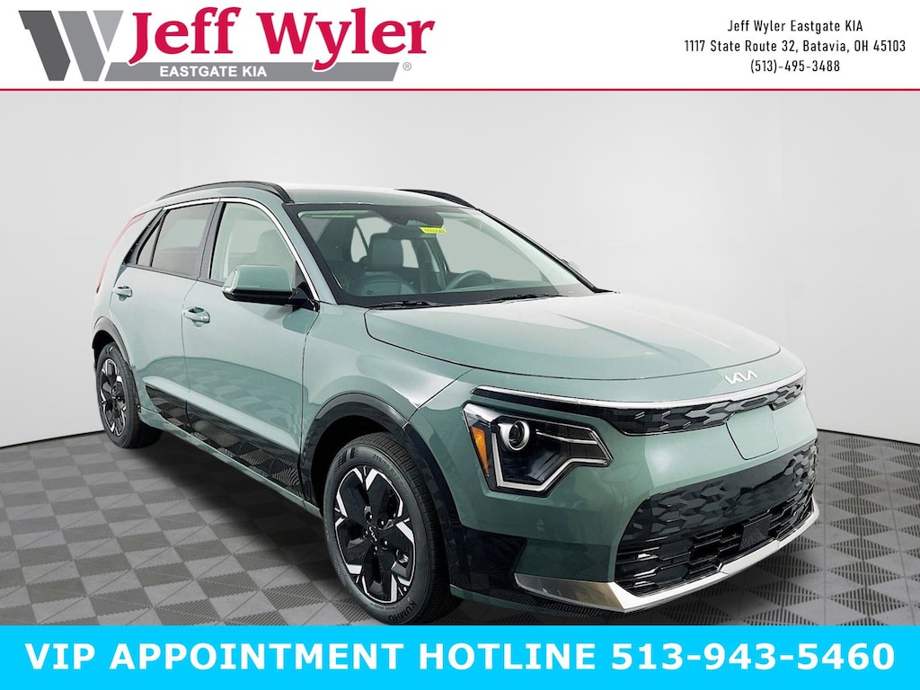 Priced below KBB Fair Purchase Price! Cityscape Green 2026 Kia Niro EV Wind Electric Motor FWD 1-Speed Automatic 126/101 City/Highway MPG Jeff Wyler Eastgate Auto Mall is honored to offer this stunning-looking 2026 Kia Niro EV Wind in Cityscape Green. Well equipped with: Wind Preserve Package (Heat Pump, Heated Rear Seats, and Heated Steering Wheel), 4-Wheel Disc Brakes, 6 Speakers, ABS brakes, Air Conditioning, Alloy wheels, AM/FM radio: SiriusXM, Apple CarPlay & Android Auto, Auto High-beam Headlights, Automatic temperature control, Brake assist, Bumpers: body-color, Carpeted Floor Mats, Cloth and Vegan Leather-Trimmed Seats, Delay-off headlights, Driver door bin, Driver vanity mirror, Dual front impact airbags, Dual front side impact airbags, Electronic Stability Control, Emergency communication system: Kia Connect (includes 1 year free trial), Four wheel independent suspension, Front anti-roll bar, Front Bucket Seats, Front Center Armrest, Front dual zone A/C, Front reading lights, Fully automatic headlights, Heated door mirrors, Heated Front Bucket Seats (3-Steps), Heated front seats, Illuminated entry, Knee airbag, Low tire pressure warning, Navigation System, Occupant sensing airbag, Outside temperature display, Overhead airbag, Overhead console, Panic alarm, Passenger door bin, Passenger vanity mirror, Power door mirrors, Power driver seat, Power Liftgate, Power steering, Power windows, Radio: HD/SiriusXM, Rain sensing wipers, Rear anti-roll bar, Rear seat center armrest, Rear window defroster, Rear window wiper, Remote keyless entry, Security system, Speed control, Speed-sensing steering, Split folding rear seat, Spoiler, Steering wheel mounted audio controls, Telescoping steering wheel, Tilt steering wheel, Traction control, Trip computer, Turn signal indicator mirrors, Variably intermittent wipers, and Wheels: 17" x 7.0J Alloy Aero. 126/101 City/Highway MPG Price includes: $10000 - Kia Customer Cash. Exp. 05/04/2026