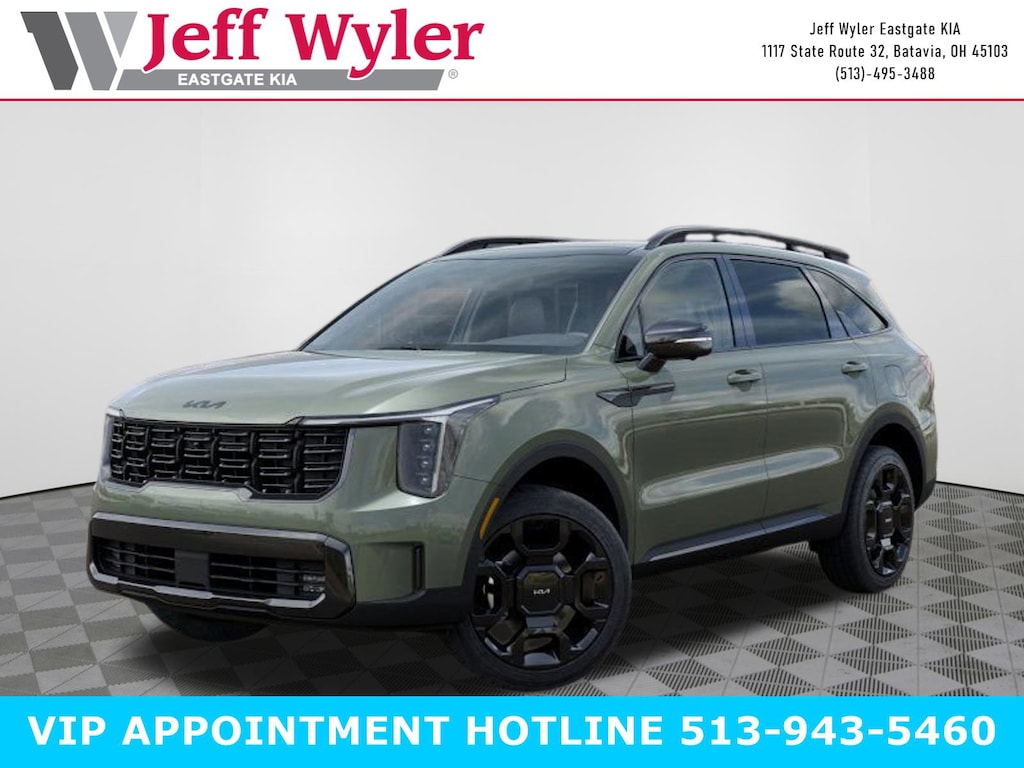Priced below KBB Fair Purchase Price! Jungle Green 2026 Kia Sorento X-Line SX Prestige 2.5L I4 DGI Turbocharged DOHC 16V LEV3-SULEV30 281hp AWD 8 Speed Dual Clutch 20/27 City/Highway MPG Jeff Wyler Eastgate Auto Mall is pleased to offer this beautiful 2026 Kia Sorento X-Line SX Prestige in Jungle Green. Well equipped with: Olive Brown Leather Package, 12 Speakers, 3rd row seats: split-bench, 4-Wheel Disc Brakes, ABS brakes, Air Conditioning, All Weather Floor Mats, Alloy wheels, AM/FM radio: SiriusXM, Apple CarPlay & Android Auto, Auto High-beam Headlights, Auto-dimming Rear-View mirror, Automatic temperature control, Brake assist, Bumpers: body-color, Cargo Cover, Delay-off headlights, Driver door bin, Driver vanity mirror, Dual front impact airbags, Dual front side impact airbags, Electronic Stability Control, Emergency communication system: 911 Connect, Exterior Parking Camera Rear, Four wheel independent suspension, Front anti-roll bar, Front Bucket Seats, Front Center Armrest, Front dual zone A/C, Front fog lights, Front reading lights, Fully automatic headlights, Garage door transmitter: HomeLink, Heated and Ventilated Front Bucket Seats, Heated door mirrors, Heated front seats, Heated rear seats, Heated steering wheel, Illuminated entry, Knee airbag, Leather Shift Knob, Leather steering wheel, Low tire pressure warning, Memory seat, Navigation System, Occupant sensing airbag, Outside temperature display, Overhead airbag, Overhead console, Panic alarm, Passenger door bin, Passenger vanity mirror, Perforated Genuine Leather Seat Trim, Power door mirrors, Power driver seat, Power Liftgate, Power moonroof, Power passenger seat, Power steering, Power windows, Radio data system, Radio: AM/FM Bose Premium Audio System, Rain sensing wipers, Rear anti-roll bar, Rear reading lights, Rear side impact airbag, Rear window defroster, Rear window wiper, Remote keyless entry, Security system, Speed control, Speed-sensing steering, Split folding rear seat, Spoiler, Steering wheel mounted audio controls, Tachometer, Telescoping steering wheel, Tilt steering wheel, Traction control, Trip computer, Turn signal indicator mirrors, Variably intermittent wipers, Ventilated front seats, Wheels: 20" Gloss Black x-Line Alloy, and X-Line Mudguards. 20/27 City/Highway MPG Price includes: $2000 - Kia Customer Cash. Exp. 03/02/2026