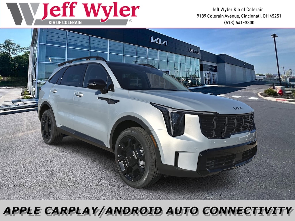 Jeff Wyler Kia of Colerain is very proud to offer this fantastic-looking 2026 Kia Sorento X-Line EX in Ivory Silver. 3rd row seats: split-bench, 4-Wheel Disc Brakes, ABS brakes, Air Conditioning, Alloy wheels, AM/FM radio: SiriusXM, Apple CarPlay & Android Auto, Auto High-beam Headlights, Auto-dimming Rear-View mirror, Automatic temperature control, Brake assist, Bumpers: body-color, Cargo Net, Cargo Tray, Carpeted Floor Mats, Delay-off headlights, Driver door bin, Driver vanity mirror, Dual front impact airbags, Dual front side impact airbags, Electronic Stability Control, Emergency communication system: 911 Connect, Exterior Parking Camera Rear, Four wheel independent suspension, Front anti-roll bar, Front Bucket Seats, Front Center Armrest, Front dual zone A/C, Front fog lights, Front reading lights, Fully automatic headlights, Heated door mirrors, Heated Front Bucket Seats, Heated front seats, Illuminated entry, Knee airbag, Leather Shift Knob, Leather steering wheel, Low tire pressure warning, Navigation System, Occupant sensing airbag, Outside temperature display, Overhead airbag, Overhead console, Panic alarm, Passenger door bin, Passenger vanity mirror, Power door mirrors, Power driver seat, Power Liftgate, Power passenger seat, Power steering, Power windows, Radio data system, Radio: AM/FM Standard Sound System, Rear anti-roll bar, Rear reading lights, Rear side impact airbag, Rear window defroster, Rear window wiper, Remote keyless entry, Security system, Speed control, Speed-sensing steering, Split folding rear seat, Spoiler, Steering wheel mounted audio controls, SynTex Artificial Leather Seat Trim, Tachometer, Telescoping steering wheel, Tilt steering wheel, Traction control, Trip computer, Turn signal indicator mirrors, and Variably intermittent wipers Our PRE-OWNED vehicles are put through a rigorous 167- POINT QUALITY ASSURANCE INSPECTION along with an average amount of over $1,400.00 SPENT to recondition each vehicle so we can be sure to deliver you the highest quality vehicle like you deserve! ***ONLINE PRICE DOES NOT INCLUDE WYLER FAMILY FIRST PACKAGE***