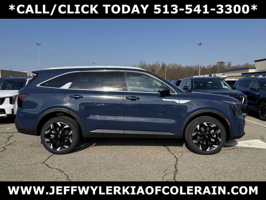 Jeff Wyler Kia of Colerain is delighted to offer this outstanding-looking 2026 Kia Sorento EX in Midnight Lake Blue. 3rd row seats: split-bench, 4-Wheel Disc Brakes, 6 Speakers, ABS brakes, Air Conditioning, Alloy wheels, AM/FM radio: SiriusXM, Apple CarPlay & Android Auto, Auto High-beam Headlights, Auto-dimming Rear-View mirror, Automatic temperature control, Brake assist, Bumpers: body-color, Delay-off headlights, Driver door bin, Driver vanity mirror, Dual front impact airbags, Dual front side impact airbags, Electronic Stability Control, Emergency communication system: 911 Connect, Exterior Parking Camera Rear, Four wheel independent suspension, Front anti-roll bar, Front Bucket Seats, Front Center Armrest, Front dual zone A/C, Front fog lights, Front reading lights, Fully automatic headlights, Heated door mirrors, Heated Front Bucket Seats, Heated front seats, Illuminated entry, Knee airbag, Leather Shift Knob, Leather steering wheel, Low tire pressure warning, Navigation System, Occupant sensing airbag, Outside temperature display, Overhead airbag, Overhead console, Panic alarm, Passenger door bin, Passenger vanity mirror, Power door mirrors, Power driver seat, Power Liftgate, Power passenger seat, Power steering, Power windows, Radio data system, Radio: AM/FM Standard Sound System, Rear anti-roll bar, Rear reading lights, Rear seat center armrest, Rear side impact airbag, Rear window defroster, Rear window wiper, Remote keyless entry, Security system, Speed control, Speed-sensing steering, Split folding rear seat, Spoiler, Steering wheel mounted audio controls, SynTex Artificial Leather Seat Trim, Tachometer, Telescoping steering wheel, Tilt steering wheel, Traction control, Trip computer, Turn signal indicator mirrors, Variably intermittent wipers, and Wheels: 20" Machine-Finished Gloss Black Alloy Our PRE-OWNED vehicles are put through a rigorous 167- POINT QUALITY ASSURANCE INSPECTION along with an average amount of over $1,400.00 SPENT to recondition each vehicle so we can be sure to deliver you the highest quality vehicle like you deserve! ***ONLINE PRICE DOES NOT INCLUDE WYLER FAMILY FIRST PACKAGE***