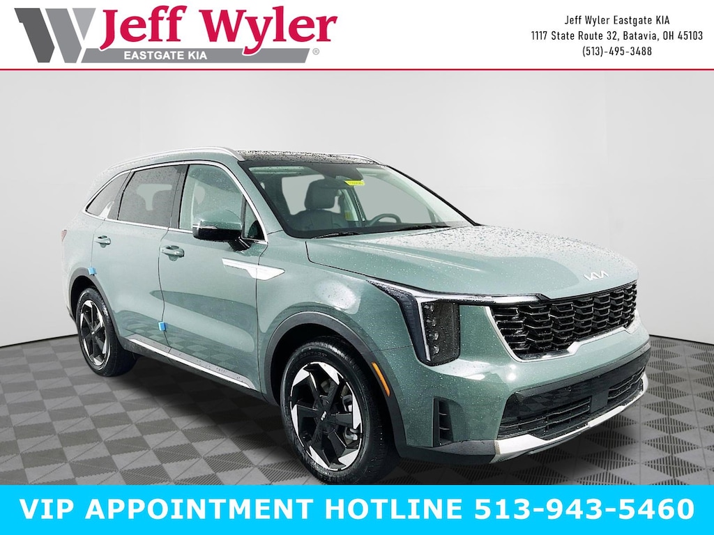 Cityscape Green 2026 Kia Sorento Hybrid EX 1.6L Turbo GDI 4-Cylinder AWD 6-Speed Automatic 32/35 City/Highway MPG Jeff Wyler Eastgate Auto Mall is honored to offer this great-looking 2026 Kia Sorento Hybrid EX in Cityscape Green. Well equipped with: EX Premium Package (2nd Row Captain's Chairs and LED Interior Lighting), 3rd row seats: split-bench, 4-Wheel Disc Brakes, 6 Speakers, ABS brakes, Air Conditioning, All Weather Floor Mats, Alloy wheels, AM/FM radio: SiriusXM, Apple CarPlay & Android Auto, Auto High-beam Headlights, Auto-Dimming Mirror with HomeLink, Auto-dimming Rear-View mirror, Automatic temperature control, Brake assist, Bumpers: body-color, Delay-off headlights, Driver door bin, Driver vanity mirror, Dual front impact airbags, Dual front side impact airbags, Electronic Stability Control, Emergency communication system: 911 Connect, Exterior Parking Camera Rear, Four wheel independent suspension, Front anti-roll bar, Front Bucket Seats, Front Center Armrest, Front dual zone A/C, Front fog lights, Front reading lights, Fully automatic headlights, Heated door mirrors, Heated Front Bucket Seats, Heated front seats, Illuminated entry, Knee airbag, Leather steering wheel, Low tire pressure warning, Navigation System, Occupant sensing airbag, Outside temperature display, Overhead airbag, Overhead console, Panic alarm, Passenger door bin, Passenger vanity mirror, Power door mirrors, Power driver seat, Power Liftgate, Power passenger seat, Power steering, Power windows, Radio data system, Radio: AM/FM/SiriusXM Audio System, Rear anti-roll bar, Rear reading lights, Rear seat center armrest, Rear side impact airbag, Rear window defroster, Rear window wiper, Remote keyless entry, Security system, Small First Aid Kit, Speed control, Speed-sensing steering, Split folding rear seat, Spoiler, Steering wheel mounted audio controls, SynTex Artificial Leather Seat Trim, Tachometer, Telescoping steering wheel, Tilt steering wheel, Traction control, Trip computer, Turn signal indicator mirrors, and Variably intermittent wipers. 32/35 City/Highway MPG Price includes: $2500 - Kia Customer Cash. Exp. 05/04/2026
