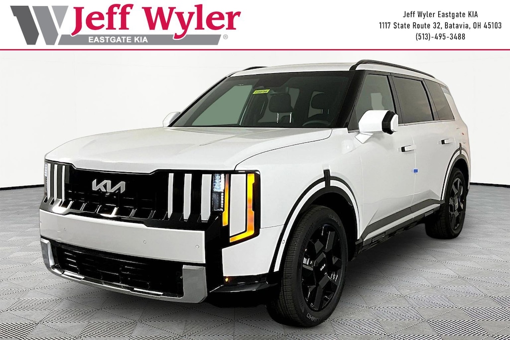 Glacial White Pearl 2027 Kia Telluride Hybrid SX Prestige 2.5L 4-Cylinder AWD 6-Speed Automatic Jeff Wyler Eastgate Auto Mall is very proud to offer this attractive 2027 Kia Telluride Hybrid SX Prestige in Glacial White Pearl. Well equipped with: Towing Package (Tow Hitch), 10-Way Power Driver Seat with Thigh Support, 14 Speakers, 3rd row seats: split-bench, 4-Wheel Disc Brakes, ABS brakes, Air Conditioning, Alloy wheels, AM/FM radio: SiriusXM, Apple CarPlay & Android Auto, Audio memory, Auto High-beam Headlights, Auto-dimming door mirrors, Auto-dimming Rear-View mirror, Auto-leveling suspension, Automatic temperature control, Brake assist, Bumpers: body-color, Carpeted Floor Mats, Compass, Delay-off headlights, Driver door bin, Driver vanity mirror, Dual front impact airbags, Dual front side impact airbags, Electronic Stability Control, Emergency communication system: 911 Connect, Exterior Parking Camera Rear, Four wheel independent suspension, Front anti-roll bar, Front Bucket Seats, Front Center Armrest, Front dual zone A/C, Front fog lights, Front reading lights, Fully automatic headlights, Garage door transmitter: HomeLink, Heads-Up Display, Heated and Ventilated Front Bucket Seats, Heated door mirrors, Heated front seats, Heated rear seats, Heated steering wheel, HVAC memory, Illuminated entry, Knee airbag, Low tire pressure warning, Memory seat, Navigation System, Occupant sensing airbag, Outside temperature display, Overhead airbag, Overhead console, Panic alarm, Passenger door bin, Passenger vanity mirror, Power door mirrors, Power driver seat, Power Liftgate, Power moonroof, Power passenger seat, Power steering, Power windows, Radio data system, Radio: 14 Speaker Meridian Audio System, Rain sensing wipers, Rear air conditioning, Rear anti-roll bar, Rear reading lights, Rear side impact airbag, Rear window defroster, Rear window wiper, Reclining 3rd row seat, Remote keyless entry, Security system, Speed control, Speed-sensing steering, Split folding rear seat, Spoiler, Steering wheel memory, Steering wheel mounted audio controls, SynTex/SynTex Suede Seat Trim, Tachometer, Telescoping steering wheel, Tilt steering wheel, Traction control, Trip computer, Turn signal indicator mirrors, Variably intermittent wipers, Ventilated front seats, Ventilated rear seats, and Wheels: 20" x 8" Type C Aluminum Alloy.