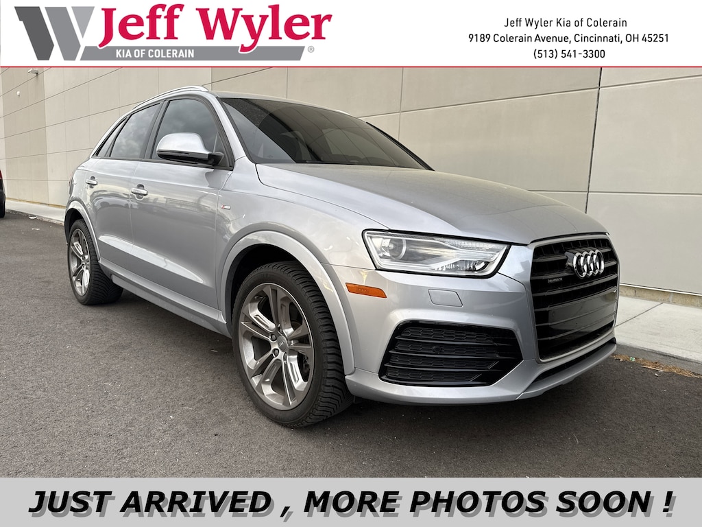 Jeff Wyler Kia of Colerain is excited to offer this gorgeous 2018 Audi Q3 2.0T Premium in Florett Silver Metallic. 10 Speakers, 4-Wheel Disc Brakes, ABS brakes, Air Conditioning, Alloy wheels, AM/FM radio: SiriusXM, Audi Guard Protection Kit, Automatic temperature control, Axle Ratio: TBD, Black HomeLink, Brake assist, Bumpers: body-color, CD player, Delay-off headlights, Driver door bin, Driver vanity mirror, Dual front impact airbags, Dual front side impact airbags, Electronic Stability Control, Exterior Parking Camera Rear, Four wheel independent suspension, Front anti-roll bar, Front Bucket Seats, Front Center Armrest, Front dual zone A/C, Front fog lights, Front reading lights, Fully automatic headlights, Heated door mirrors, Heated front seats, High intensity discharge headlights: Xenon plus, Illuminated entry, Leather Seating Surfaces, Leather Shift Knob, Leather steering wheel, Low tire pressure warning, Occupant sensing airbag, Outside temperature display, Overhead airbag, Overhead console, Panic alarm, Passenger door bin, Passenger vanity mirror, Power door mirrors, Power driver seat, Power moonroof, Power passenger seat, Power steering, Power windows, Radio data system, Radio: Audi Concert System w/AM/FM Radio, Rain sensing wipers, Rear anti-roll bar, Rear fog lights, Rear reading lights, Rear seat center armrest, Rear window defroster, Rear window wiper, Remote keyless entry, Roof rack: rails only, Security system, Speed control, Speed-sensing steering, Split folding rear seat, Spoiler, Steering wheel mounted audio controls, Tachometer, Telescoping steering wheel, Tilt steering wheel, Traction control, Trip computer, Turn signal indicator mirrors, and Variably intermittent wipers Our PRE-OWNED vehicles are put through a rigorous 167- POINT QUALITY ASSURANCE INSPECTION along with an average amount of over $1,400.00 SPENT to recondition each vehicle so we can be sure to deliver you the highest quality vehicle like you deserve! ***ONLINE PRICE DOES NOT INCLUDE WYLER FAMILY FIRST PACKAGE***