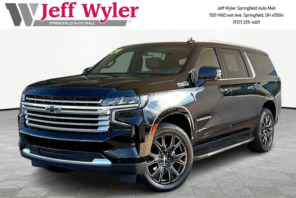 Jeff Wyler Springfield Auto Mall is proud to offer this beautiful-looking 2021 Chevrolet Suburban High Country in Black. Well equipped with: License Plate Front Mounting Package, Preferred Equipment Group 3LZ (12-Way Power Driver & Passenger Seat Adjusters, 15" Diagonal Multi-Color Head-Up Display, 1st & 2nd Row Color-Keyed Carpeted Floor Mats, 2 USB Data Ports, 2-Speed Active Electronic AutoTrac Transfer Case, 3rd Row 60/40 Power-Folding Split-Bench, Automatic Heated Steering Wheel, Bose 10-Speaker Surround w/CenterPoint, Bright Front & Rear Door Sill Plates, Chrome Door Handles w/Body-Color Strip, Color-Keyed Carpeting Floor Covering, Driver & Front Outboard Passenger Airbags, Dual Exhaust System, Enhanced Driver Information Center, Floor Console w/Storage Area, Front & Rear Park Assist, Hands-Free Rear Power Programmable Liftgate, HD Radio, HD Surround Vision, Heated & Ventilated Driver & Front Passenger Seats, Heated 2nd Row Outboard Seats, Heated Driver & Front Passenger Seats, Hill Descent Control, Infotainment Display, Inside Rearview Auto-Dimming Rear Camera Mirror, Lane Change Alert w/Side Blind Zone Alert, Lane Keep Assist w/Lane Departure Warning, Leather-Wrapped Steering Wheel, LED Daytime Running Lamps, Memory Settings, Outside Heated Power-Adjustable Mirrors, Power Release 2nd Row Bucket Seats, Power Tilt & Telescopic Steering Column, Rear Camera Mirror Washer, Rear Cross Traffic Alert, Rear Pedestrian Alert, Remote Start, Safety Alert Seat, SiriusXM Radio w/360L, and Universal Home Remote), 10 Speakers, 3.23 Rear Axle Ratio, 3rd row seats: split-bench, 4-Wheel Disc Brakes, ABS brakes, Adaptive suspension, Air Conditioning, Alloy wheels, AM/FM radio: SiriusXM with 360L, Apple CarPlay/Android Auto, Auto High-beam Headlights, Auto-dimming door mirrors, Auto-dimming Rear-View mirror, Auto-leveling suspension, Automatic temperature control, Brake assist, Bumpers: body-color, Compass, Delay-off headlights, Driver door bin, Driver vanity mirror, Dual front impact airbags, Dual front side impact airbags, Electronic Stability Control, Emergency communication system: OnStar and Chevrolet connected services capable, Four wheel independent suspension, Front & Rear Black Bowtie Emblems (LPO), Front anti-roll bar, Front Bucket Seats, Front Center Armrest, Front dual zone A/C, Front reading lights, Fully automatic headlights, Garage door transmitter, Heads-Up Display, Heated door mirrors, Heated front seats, Heated rear seats, Heated steering wheel, Illuminated entry, Leather steering wheel, Low tire pressure warning, Magnetic Ride Control Suspension, Memory seat, Navigation System, Occupant sensing airbag, Outside temperature display, Overhead airbag, Overhead console, Panic alarm, Passenger door bin, Passenger vanity mirror, Perforated Leather Seating Surfaces, Power door mirrors, Power driver seat, Power Liftgate, Power passenger seat, Power steering, Power windows, Premium audio system: Chevrolet Infotainment 3 Premium, Radio: Chevrolet Infotainment 3 Premium System, Rain sensing wipers, Rear air conditioning, Rear anti-roll bar, Rear reading lights, Rear window defroster, Rear window wiper, Remote keyless entry, Roof rack: rails only, Security system, Speed control, Speed-sensing steering, Split folding rear seat, Spoiler, Steering wheel memory, Steering wheel mounted audio controls, Tachometer, Telescoping steering wheel, Tilt steering wheel, Traction control, Trip computer, Turn signal indicator mirrors, Variably intermittent wipers, Ventilated front seats, Voltmeter, Wheel Locks (Set of 4) (LPO), Wheels: 22" Carbon Flash Metallic (LPO), Wheels: 22" Steel (LPO), and Wheels: 22" x 9" Sterling Silver Premium Painted. Ask about available certifications. Used vehicles 10 years of age or newer with less than 100,000 miles are eligible for the Wyler Assurance Program, but eligible vehicles must pass our reconditioning process and multi-point inspection. Provided the vehicle passes inspection, vehicles will be eligible for the