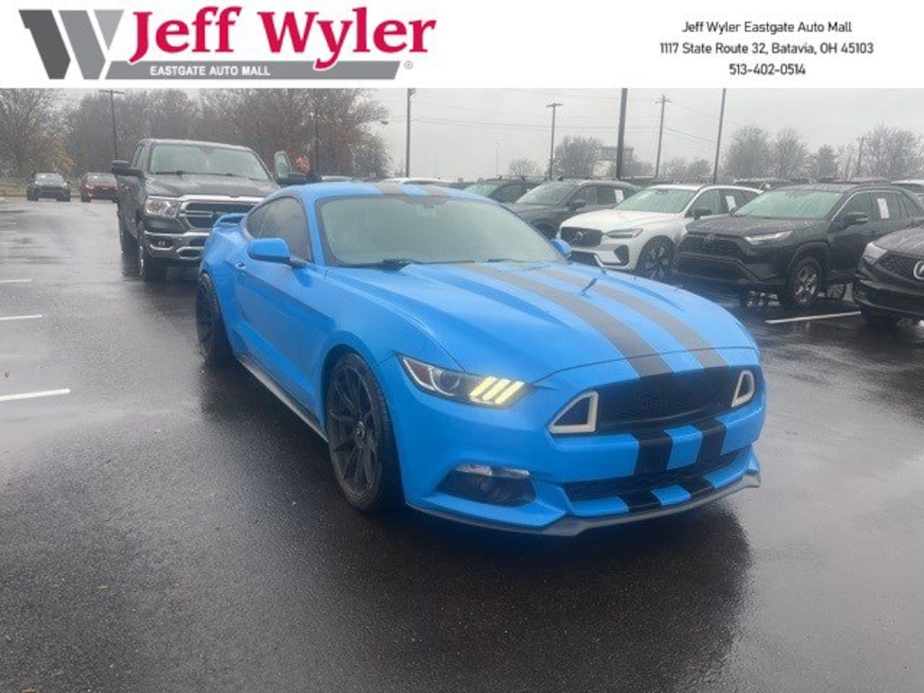 Jeff Wyler Eastgate Auto Mall is very proud to offer this wonderful-looking 2017 Ford Mustang EcoBoost in Grabber Blue. Well equipped with: Equipment Group 100A, 4-Wheel Disc Brakes, 6 Speakers, ABS brakes, Air Conditioning, Alloy wheels, AM/FM radio, AM/FM Stereo w/Single CD Player, Auto-dimming Rear-View mirror, Brake assist, Bumpers: body-color, CD player, Cloth Sport Bucket Seats, Compass, Delay-off headlights, Driver door bin, Driver vanity mirror, Dual front impact airbags, Dual front side impact airbags, Electronic Stability Control, Emergency communication system: 911 Assist, Exterior Parking Camera Rear, Four wheel independent suspension, Front anti-roll bar, Front Bucket Seats, Front Center Armrest, Front reading lights, Fully automatic headlights, High-Intensity Discharge Headlights, Illuminated entry, Knee airbag, Leather Shift Knob, Low tire pressure warning, Occupant sensing airbag, Outside temperature display, Overhead airbag, Overhead console, Panic alarm, Passenger door bin, Passenger vanity mirror, Power door mirrors, Power driver seat, Power passenger seat, Power steering, Power windows, Radio data system, Rear anti-roll bar, Rear window defroster, Remote keyless entry, Security system, Speed control, Speed-sensing steering, Speed-Sensitive Wipers, Split folding rear seat, Spoiler, Steering wheel mounted audio controls, SYNC Communications & Entertainment System, Tachometer, Telescoping steering wheel, Tilt steering wheel, Traction control, Trip computer, Variably intermittent wipers, Voltmeter, and Wheels: 18" x 8" Magnetic Painted/Machined. Awards: * 2017 KBB.com 10 Best Used Sports Cars Under $30,000 * 2017 KBB.com 10 Coolest Cars Under $25,000 * 2017 KBB.com Brand Image Awards * 2017 KBB.com 10 Most Awarded Brands Ask about available certifications. Used vehicles 10 years of age or newer with less than 100,000 miles are eligible for the Wyler Assurance Program, but eligible vehicles must pass our reconditioning process and multi-point inspection. Provided the vehicle passes inspection, vehicles will be eligible for the 6 month/6,000 mile limited warranty. The 6 month/6,000 mile limited warranty is NOT available on AS-IS vehicles, wholesale vehicles, lease buyback/pass-thru vehicles or un-inspected vehicles. Note that this program can also apply to vehicles where the remaining factory coverage is less than 6 months or 6,000 miles. Please check the Federal Trade Commission (FTC) Buyers guide on the vehicle for full details as to whether or not warranty coverage may apply. Contact Dealer for additional details. The Wyler Assurance 6 month/6,000 Mile limited warranty ends 6 months from the date of the Retail Purchase Agreement (BUYERS ORDER) or when the vehicle's odometer registers 6,000 additional miles to the mileage listed on the BUYERS ORDER, whichever comes first. Your Deductible - The warranty holder on your contract pays the first $100 of each covered repair.