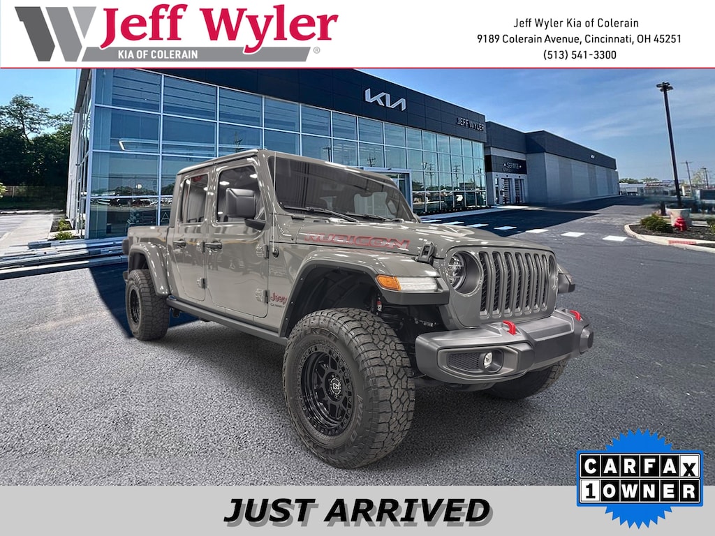 Jeff Wyler Kia of Colerain is honored to offer this gorgeous-looking 2022 Jeep Gladiator Rubicon in Sting-Gray Clearcoat. Cold Weather Group (Heated Front Seats and Heated Steering Wheel), LED Lighting Group (Daytime Running Lamps LED Accents, Front LED Fog Lamps, LED Park Turn Lamps, LED Premium Reflector Headlamps, and LED Taillamps), Quick Order Package 24R, Trailer Tow Package (240 Amp Alternator, Class IV Receiver Hitch, Heavy-Duty Engine Cooling, and Trailer Hitch Zoom), 4-Wheel Disc Brakes, 4:1 Rock-Trac HD Full Time 4WD System, 4.10 Rear Axle Ratio, 9 Speakers, 97 MPH Vehicle Max Speed Calibration, ABS brakes, Air Conditioning, Alloy wheels, AM/FM radio: SiriusXM, Apple CarPlay/Android Auto, Auto-dimming Rear-View mirror, Automatic temperature control, Black 3-Piece Hard Top, Body Color Fender Flares (2-Piece), Brake assist, Compass, Delay-off headlights, Driver door bin, Driver vanity mirror, Dual front impact airbags, Dual front side impact airbags, Electronic Stability Control, Emergency communication system: SiriusXM Guardian, Freedom Panel Storage Bag, Front anti-roll bar, Front Bucket Seats, Front Center Armrest w/Storage, Front dual zone A/C, Front fog lights, Front License Plate Bracket, Front reading lights, Fully automatic headlights, Garage door transmitter, Heated door mirrors, Illuminated entry, Integrated roll-over protection, Leather steering wheel, Low tire pressure warning, MOPAR All-Weather Slush Mats, MOPAR Grab Handle Kit, MOPAR Hardtop Headliner, MOPAR Spray In Bedliner, Navigation System, Occupant sensing airbag, Outside temperature display, Panic alarm, ParkView Rear Back-Up Camera, Passenger door bin, Passenger vanity mirror, Performance Suspension, Power door mirrors, Power steering, Power windows, Premium Cloth Low-Back Bucket Seats, Radio data system, Radio: Uconnect 4C Nav w/8.4" Display, Rear anti-roll bar, Rear reading lights, Rear Sliding Window, Rear Window Defroster, Remote keyless entry, Remote Start System, Security system, Speed control, Split folding rear seat, Steering wheel mounted audio controls, Tachometer, Telescoping steering wheel, Tilt steering wheel, Traction control, Trip computer, Variably intermittent wipers, Voltmeter, Wheels: 17" x 7.5" Granite Crystal Aluminum, and Wheels: 17" x 7.5" Polished Black Aluminum Our PRE-OWNED vehicles are put through a rigorous 167- POINT QUALITY ASSURANCE INSPECTION along with an average amount of over $1,400.00 SPENT to recondition each vehicle so we can be sure to deliver you the highest quality vehicle like you deserve! ***ONLINE PRICE DOES NOT INCLUDE WYLER FAMILY FIRST PACKAGE***