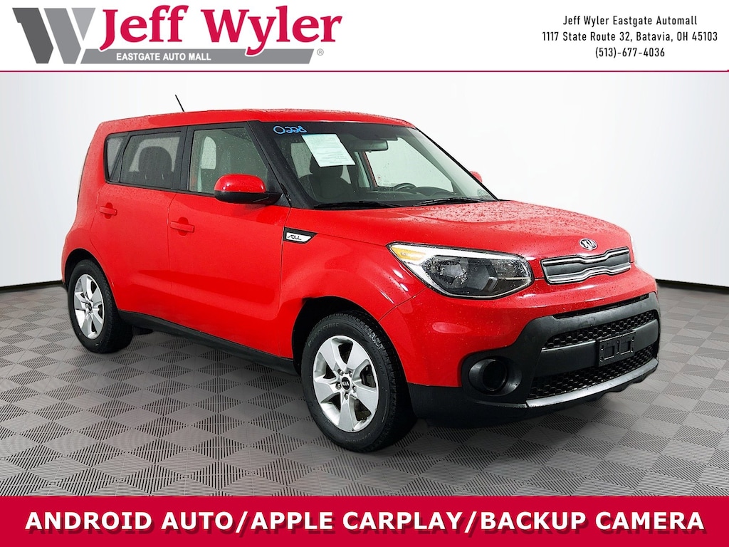 Jeff Wyler Eastgate Auto Mall is excited to offer this beautiful-looking 2019 Kia Soul in Inferno Red. Well equipped with: 16" Alloy Wheels, 4-Wheel Disc Brakes, 6 Speakers, 6-Way Adjustable Driver's Seat, ABS brakes, Air Conditioning, Alloy wheels, AM/FM radio: SiriusXM, Brake assist, Bumpers: body-color, Carpeted Floor Mat, Cloth Seat Trim, Driver door bin, Driver vanity mirror, Dual front impact airbags, Dual front side impact airbags, Electronic Stability Control, Exterior Parking Camera Rear, Front anti-roll bar, Front Bucket Seats, Front Center Armrest, Front reading lights, Front wheel independent suspension, Fully automatic headlights, Illuminated entry, Low tire pressure warning, Occupant sensing airbag, Outside temperature display, Overhead airbag, Overhead console, Panic alarm, Passenger door bin, Passenger vanity mirror, Power door mirrors, Power steering, Power windows, Radio: AM/FM/MP3 Audio System, Rear window defroster, Rear window wiper, Remote keyless entry, Speed control, Speed-sensing steering, Split folding rear seat, Steering wheel mounted audio controls, Tachometer, Telescoping steering wheel, Tilt steering wheel, Traction control, Trip computer, and Variably intermittent wipers. CARFAX One-Owner. Clean CARFAX. Awards: * 2019 KBB.com 5-Year Cost to Own Awards * 2019 KBB.com 10 Coolest New Cars Under $20,000 Ask about available certifications. Used vehicles 10 years of age or newer with less than 100,000 miles are eligible for the Wyler Assurance Program, but eligible vehicles must pass our reconditioning process and multi-point inspection. Provided the vehicle passes inspection, vehicles will be eligible for the 6 month/6,000 mile limited warranty. The 6 month/6,000 mile limited warranty is NOT available on AS-IS vehicles, wholesale vehicles, lease buyback/pass-thru vehicles or un-inspected vehicles. Note that this program can also apply to vehicles where the remaining factory coverage is less than 6 months or 6,000 miles. Please check the Federal Trade Commission (FTC) Buyers guide on the vehicle for full details as to whether or not warranty coverage may apply. Contact Dealer for additional details. The Wyler Assurance 6 month/6,000 Mile limited warranty ends 6 months from the date of the Retail Purchase Agreement (BUYERS ORDER) or when the vehicle's odometer registers 6,000 additional miles to the mileage listed on the BUYERS ORDER, whichever comes first. Your Deductible - The warranty holder on your contract pays the first $100 of each covered repair.