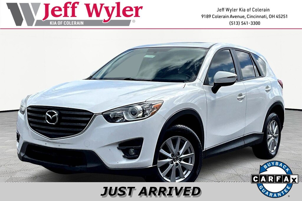 Jeff Wyler Kia of Colerain is very proud to offer this good-looking 2016 Mazda CX-5 Touring in Crystal White Pearl Mica. BOSE/Moonroof Package, 17 x 7J Aluminum Alloy Wheels, 4-Wheel Disc Brakes, 4.624 Axle Ratio, 6 Speakers, ABS brakes, Air Conditioning, Alloy wheels, AM/FM radio, Brake assist, Bumpers: body-color, CD player, Cloth Seat Trim, Delay-off headlights, Driver door bin, Driver vanity mirror, Dual front impact airbags, Dual front side impact airbags, Electronic Stability Control, Exterior Parking Camera Rear, Four wheel independent suspension, Front anti-roll bar, Front Bucket Seats, Front Center Armrest, Front fog lights, Front reading lights, Illuminated entry, Leather Shift Knob, Low tire pressure warning, Occupant sensing airbag, Outside temperature display, Overhead airbag, Overhead console, Panic alarm, Passenger door bin, Passenger vanity mirror, Power door mirrors, Power driver seat, Power steering, Power windows, Radio data system, Radio: AM/FM/CD/HD Modular Audio System w/6 Spkrs, Rear anti-roll bar, Rear reading lights, Rear seat center armrest, Rear window defroster, Rear window wiper, Remote keyless entry, Speed control, Speed-sensing steering, Split folding rear seat, Spoiler, Steering wheel mounted audio controls, Tachometer, Telescoping steering wheel, Tilt steering wheel, Traction control, Trip computer, Turn signal indicator mirrors, Variably intermittent wipers, and Wheel Locks Our PRE-OWNED vehicles are put through a rigorous 167- POINT QUALITY ASSURANCE INSPECTION along with an average amount of over $1,400.00 SPENT to recondition each vehicle so we can be sure to deliver you the highest quality vehicle like you deserve! ***ONLINE PRICE DOES NOT INCLUDE WYLER FAMILY FIRST PACKAGE***