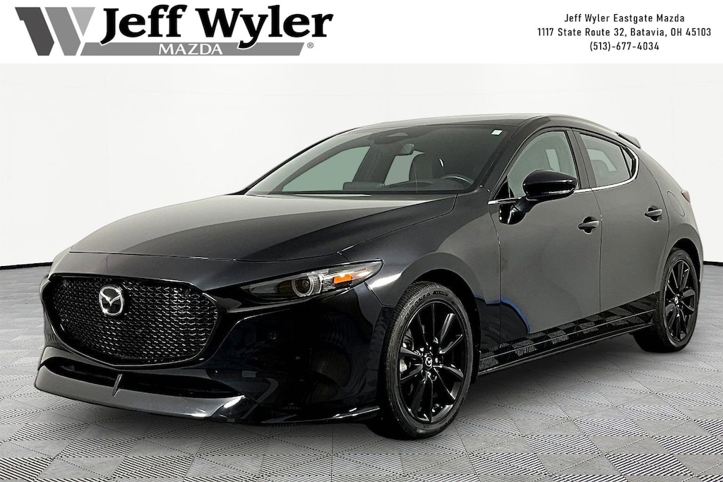 Jeff Wyler Eastgate Auto Mall is honored to offer this attractive-looking 2024 Mazda Mazda3 2.5 Turbo Premium Plus Package in Jet Black Mica. Well equipped with: 12 Speakers, 4-Wheel Disc Brakes, ABS brakes, Air Conditioning, Alloy wheels, AM/FM radio: SiriusXM, Auto High-beam Headlights, Auto-dimming door mirrors, Auto-dimming Rear-View mirror, Automatic temperature control, Brake assist, Bumpers: body-color, Compass, Delay-off headlights, Driver door bin, Driver vanity mirror, Dual front impact airbags, Dual front side impact airbags, Electronic Stability Control, Emergency communication system: Mazda Connected Services (3-year complimentary trial included), Front anti-roll bar, Front Bucket Seats, Front Center Armrest, Front dual zone A/C, Front reading lights, Front wheel independent suspension, Fully automatic headlights, Garage door transmitter: HomeLink, Heads-Up Display, Heated door mirrors, Heated Front Bucket Seats, Heated front seats, Heated steering wheel, Illuminated entry, Knee airbag, Leather Seat Trim, Leather Shift Knob, Leather steering wheel, Low tire pressure warning, MAZDA CONNECT Infotainment System, Memory seat, Navigation System, Occupant sensing airbag, Outside temperature display, Overhead airbag, Overhead console, Panic alarm, Passenger door bin, Passenger vanity mirror, Power door mirrors, Power driver seat, Power moonroof, Power steering, Power windows, Radio data system, Radio: AM/FM/HD Audio System, Rain sensing wipers, Rear seat center armrest, Rear side impact airbag, Rear window defroster, Rear window wiper, Remote keyless entry, Speed control, Speed-sensing steering, Split folding rear seat, Spoiler, Steering wheel mounted audio controls, Tachometer, Telescoping steering wheel, Tilt steering wheel, Traction control, Trip computer, Turn signal indicator mirrors, Variably intermittent wipers, and Wheels: 18" x 7J Aluminum Alloy. CARFAX One-Owner. Clean CARFAX. Ask about available certifications. Used vehicles 10 years of age or newer with less than 100,000 miles are eligible for the Wyler Assurance Program, but eligible vehicles must pass our reconditioning process and multi-point inspection. Provided the vehicle passes inspection, vehicles will be eligible for the 6 month/6,000 mile limited warranty. The 6 month/6,000 mile limited warranty is NOT available on AS-IS vehicles, wholesale vehicles, lease buyback/pass-thru vehicles or un-inspected vehicles. Note that this program can also apply to vehicles where the remaining factory coverage is less than 6 months or 6,000 miles. Please check the Federal Trade Commission (FTC) Buyers guide on the vehicle for full details as to whether or not warranty coverage may apply. Contact Dealer for additional details. The Wyler Assurance 6 month/6,000 Mile limited warranty ends 6 months from the date of the Retail Purchase Agreement (BUYERS ORDER) or when the vehicle's odometer registers 6,000 additional miles to the mileage listed on the BUYERS ORDER, whichever comes first. Your Deductible - The warranty holder on your contract pays the first $100 of each covered repair.