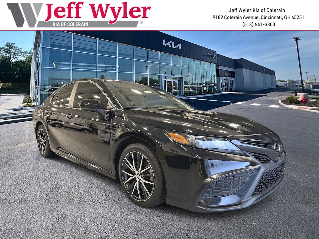 Jeff Wyler Kia of Colerain is proud to offer this gorgeous-looking 2021 Toyota Camry SE in Midnight Black Metallic. 4-Wheel Disc Brakes, 6 Speakers, ABS brakes, Air Conditioning, Alloy wheels, AM/FM radio: SiriusXM, Apple CarPlay/Android Auto, Auto High-beam Headlights, Automatic temperature control, Brake assist, Bumpers: body-color, Delay-off headlights, Driver door bin, Driver vanity mirror, Dual front impact airbags, Dual front side impact airbags, Electronic Stability Control, Emergency communication system: Safety Connect with 1-year trial, Exterior Parking Camera Rear, Fabric Seat Trim w/Sport SofTex, Four wheel independent suspension, Front anti-roll bar, Front Bucket Seats, Front Center Armrest, Front reading lights, Fully automatic headlights, Illuminated entry, Knee airbag, Low tire pressure warning, Occupant sensing airbag, Outside temperature display, Overhead airbag, Overhead console, Panic alarm, Passenger door bin, Passenger vanity mirror, Power door mirrors, Power driver seat, Power steering, Power windows, Radio data system, Radio: AM/FM Audio System, Rear anti-roll bar, Rear seat center armrest, Rear side impact airbag, Rear window defroster, Remote keyless entry, Security system, Speed control, Speed-sensing steering, Split folding rear seat, Spoiler, Steering wheel mounted audio controls, Tachometer, Telescoping steering wheel, Tilt steering wheel, Traction control, Trip computer, Variably intermittent wipers, and Wheels: 8.0J x 18" Black Machined-Finish Alloy Our PRE-OWNED vehicles are put through a rigorous 167- POINT QUALITY ASSURANCE INSPECTION along with an average amount of over $1,400.00 SPENT to recondition each vehicle so we can be sure to deliver you the highest quality vehicle like you deserve! ***ONLINE PRICE DOES NOT INCLUDE WYLER FAMILY FIRST PACKAGE***