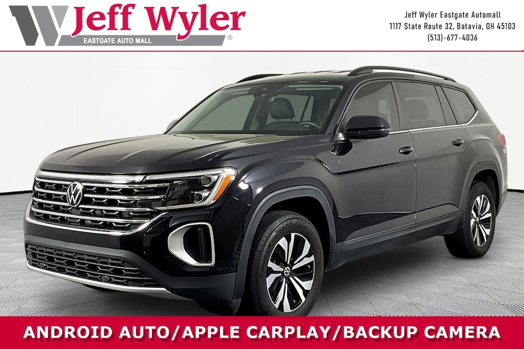 Jeff Wyler Eastgate Auto Mall is proud to offer this beautiful 2024 Volkswagen Atlas 2.0T SE in Deep Black. Well equipped with: 3.60 Axle Ratio, 3rd row seats: split-bench, 4-Wheel Disc Brakes, 6 Speakers, ABS brakes, Air Conditioning, Alloy wheels, AM/FM radio: SiriusXM with 360L, Auto-dimming Rear-View mirror, Automatic temperature control, Brake assist, Bumpers: body-color, Compass, Delay-off headlights, Driver door bin, Driver vanity mirror, Dual front impact airbags, Dual front side impact airbags, Electronic Stability Control, Emergency communication system: VW Car-Net Safe & Secure 5-year, Exterior Parking Camera Rear, Four wheel independent suspension, Front anti-roll bar, Front Bucket Seats, Front Center Armrest, Front dual zone A/C, Front fog lights, Front reading lights, Fully automatic headlights, Heated door mirrors, Heated front seats, Heated steering wheel, Heated/Actively Ventilated Front Bucket Seats, Illuminated entry, Low tire pressure warning, Occupant sensing airbag, Outside temperature display, Overhead airbag, Overhead console, Panic alarm, Passenger door bin, Passenger vanity mirror, Perforated V-Tex Leatherette Seating Surfaces, Power door mirrors, Power driver seat, Power steering, Power windows, Radio data system, Radio: MIB3 Composition Media, Rain sensing wipers, Rear air conditioning, Rear anti-roll bar, Rear reading lights, Rear seat center armrest, Rear window defroster, Rear window wiper, Remote keyless entry, Rubber Mats - Bench Seat, Security system, Speed control, Speed-sensing steering, Split folding rear seat, Spoiler, Standard Suspension, Steering wheel mounted audio controls, Tachometer, Telescoping steering wheel, Tilt steering wheel, Traction control, Trip computer, Turn signal indicator mirrors, Variably intermittent wipers, Ventilated front seats, and Wheels: 18" 2-Tone Machined Alloy. Clean CARFAX. Ask about available certifications. Used vehicles 10 years of age or newer with less than 100,000 miles are eligible for the Wyler Assurance Program, but eligible vehicles must pass our reconditioning process and multi-point inspection. Provided the vehicle passes inspection, vehicles will be eligible for the 6 month/6,000 mile limited warranty. The 6 month/6,000 mile limited warranty is NOT available on AS-IS vehicles, wholesale vehicles, lease buyback/pass-thru vehicles or un-inspected vehicles. Note that this program can also apply to vehicles where the remaining factory coverage is less than 6 months or 6,000 miles. Please check the Federal Trade Commission (FTC) Buyers guide on the vehicle for full details as to whether or not warranty coverage may apply. Contact Dealer for additional details. The Wyler Assurance 6 month/6,000 Mile limited warranty ends 6 months from the date of the Retail Purchase Agreement (BUYERS ORDER) or when the vehicle's odometer registers 6,000 additional miles to the mileage listed on the BUYERS ORDER, whichever comes first. Your Deductible - The warranty holder on your contract pays the first $100 of each covered repair.